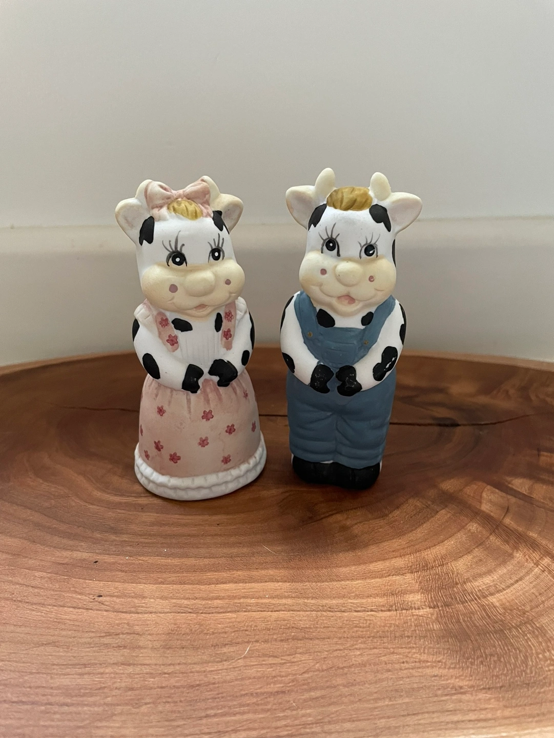 Super adorable ceramic salt and pepper shakers that are little female/male cows with vintage farmers clothing! Both have their stoppers!