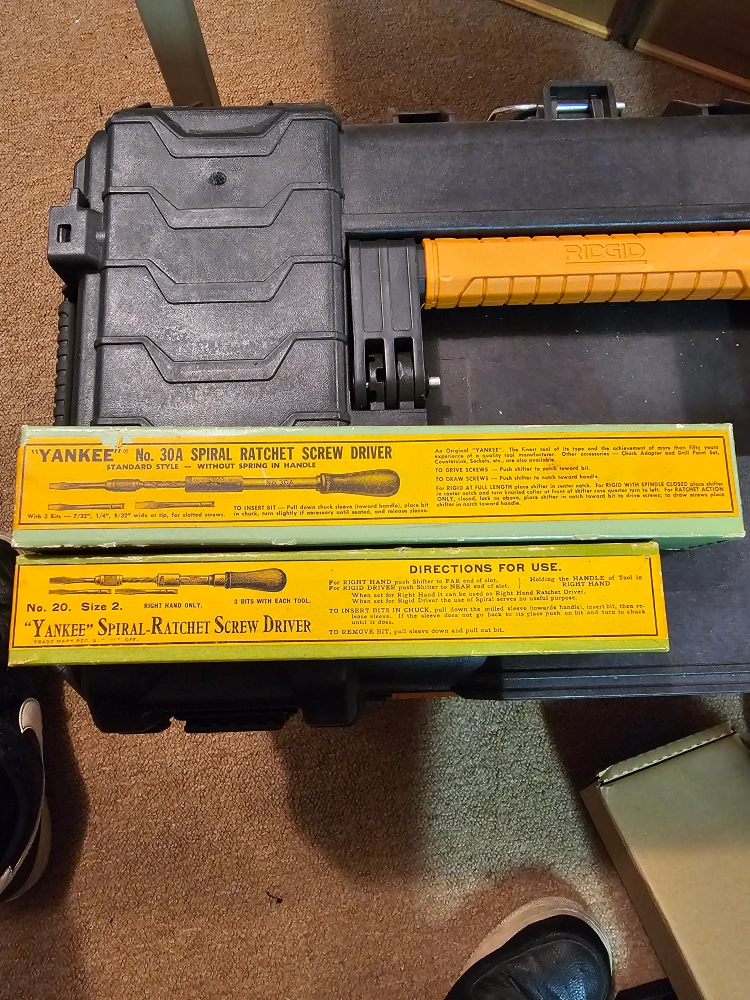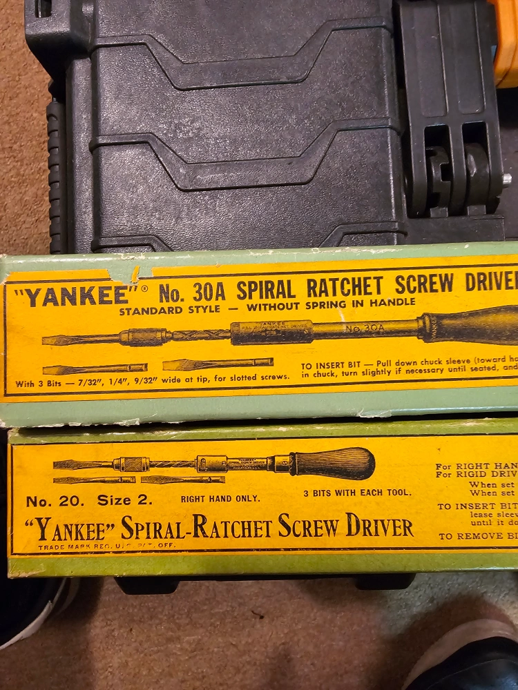 Selling two vintage Yankee spiral ratchet screwdrivers! One is a No. 30A standard style without spring in handle, and the other is a No. 20, size 2 right hand only. Each comes with bits