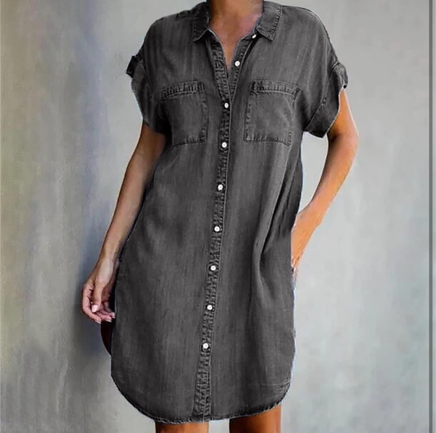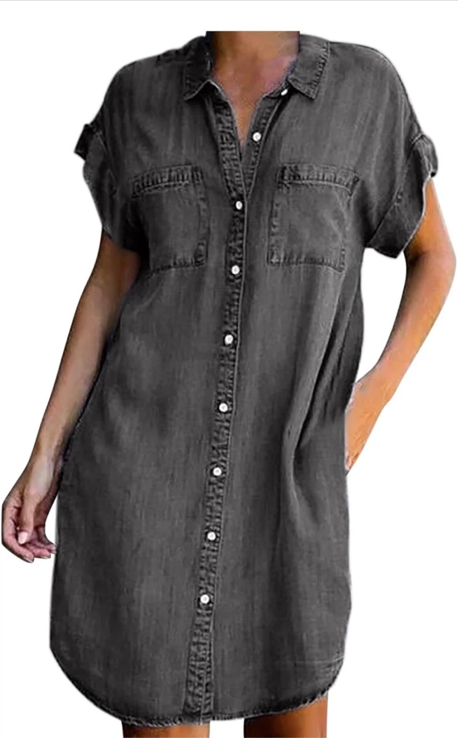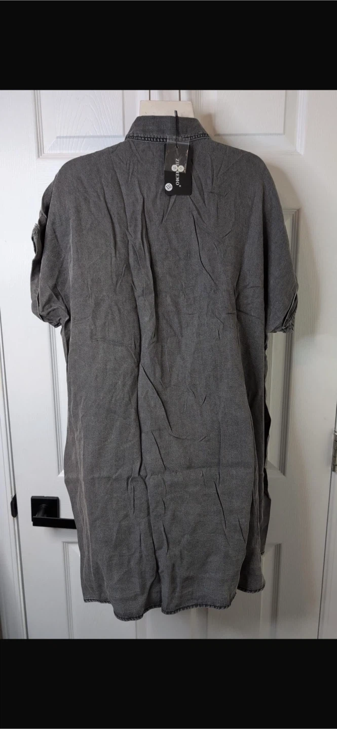 New with tag! This is a ZILCREMO short-sleeve denim shirt dress in a classic grey wash. It features a button-front closure and two chest pockets. Size XXL.