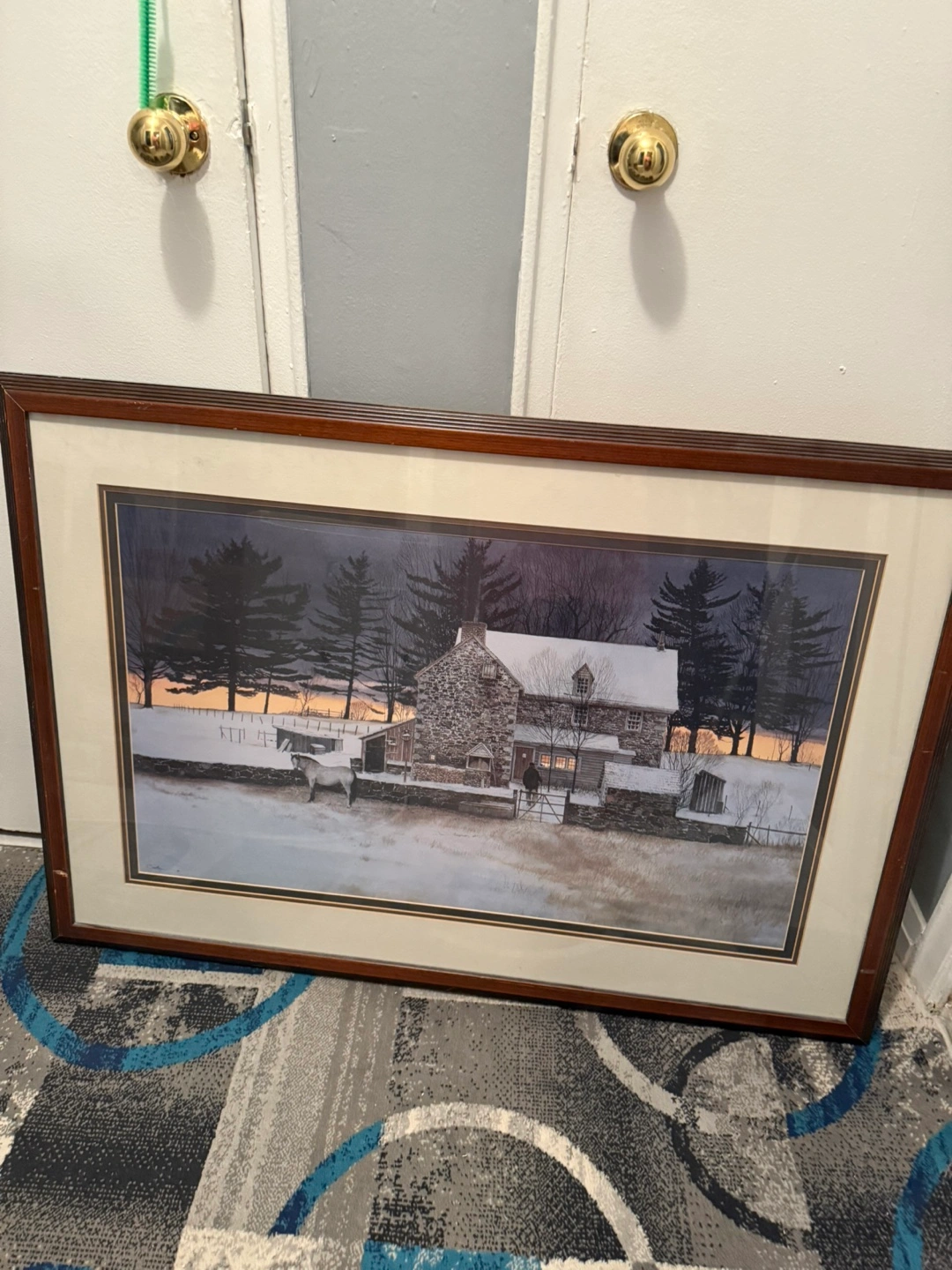 A framed print depicting a winter scene with a stone house, trees, and a horse in a snowy landscape. The frame is a dark wood colour. It would make a lovely addition to your home decor