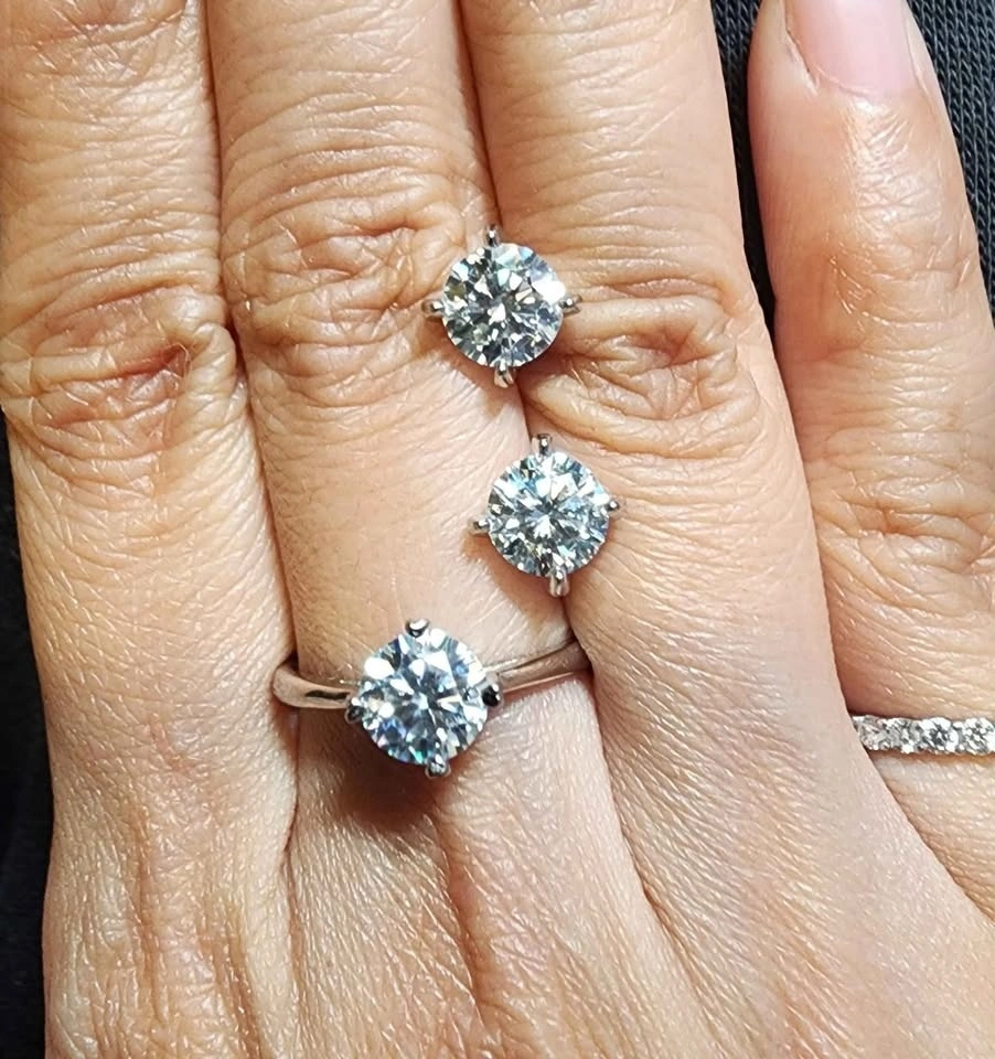 Brand new Moissanite set. Ring: 1 carat, band size adjustable. Earrings: 1 pair, 1 carat each. Made with S925 sterling silver. Inquire if you're interested in matching 2 or 3 carat options.