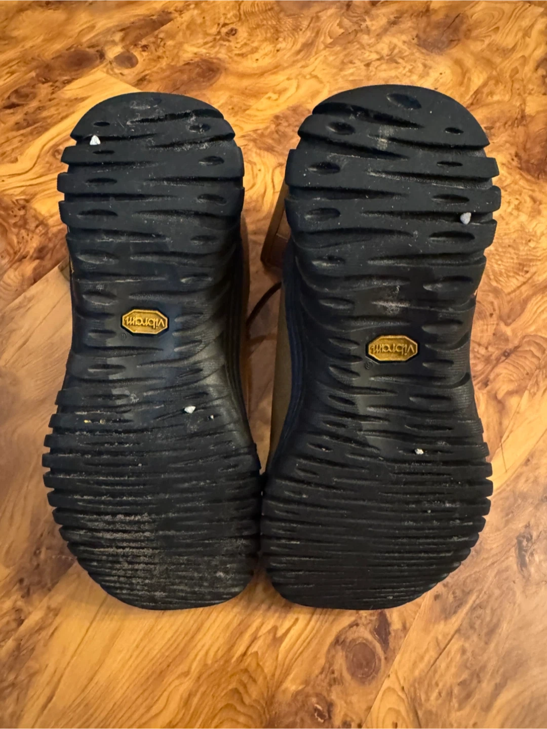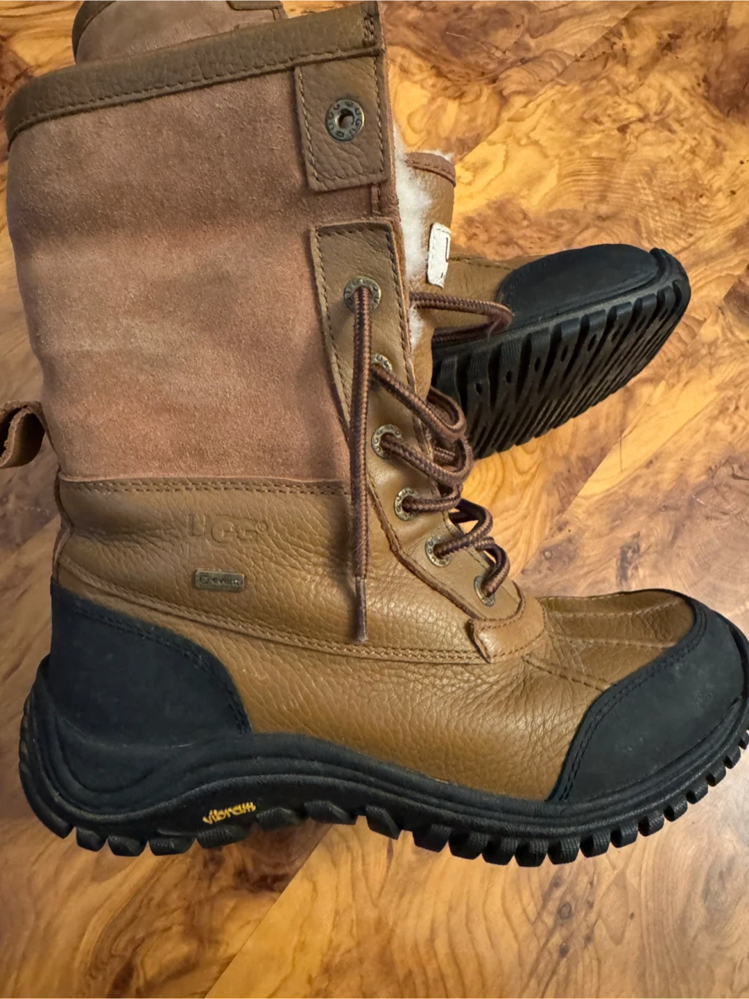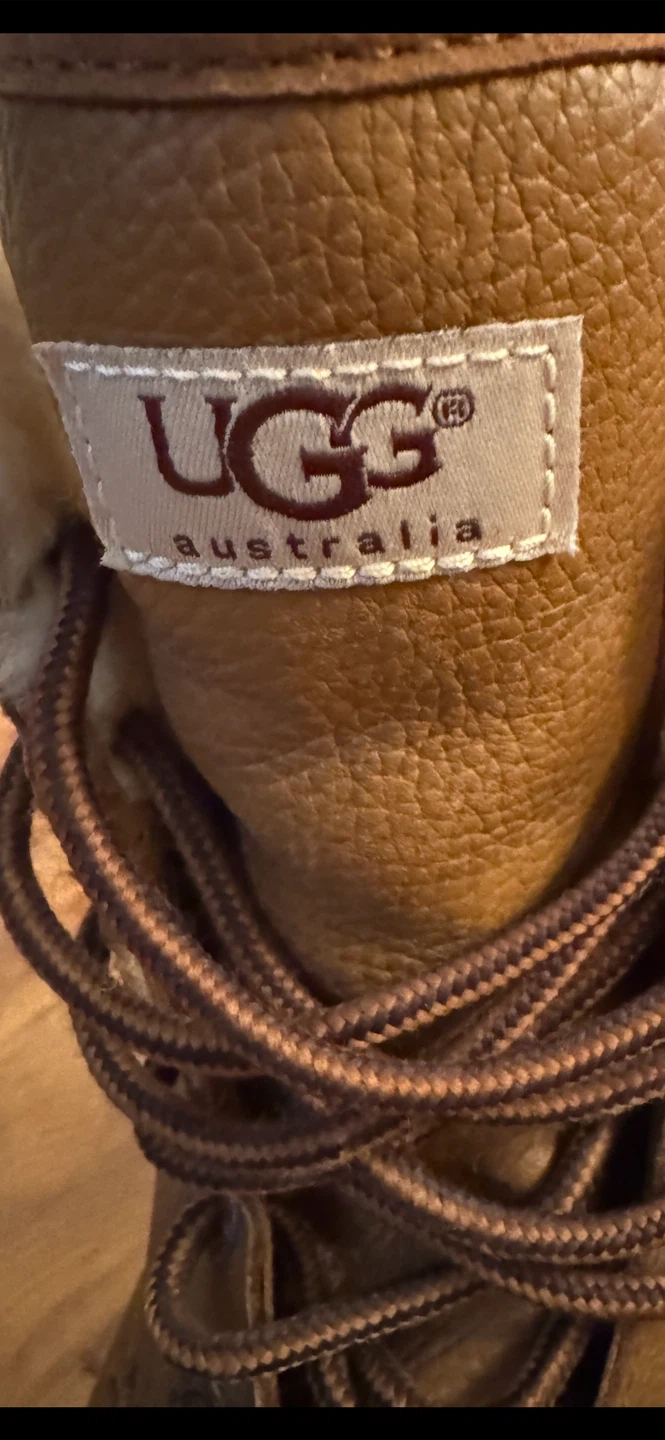 These UGG Australia boots are crafted from durable leather and suede with a warm shearling lining. They feature a Vibram sole for excellent traction and are designed to keep your feet cozy and dry. Perfect for cold weather adventures! Size 8