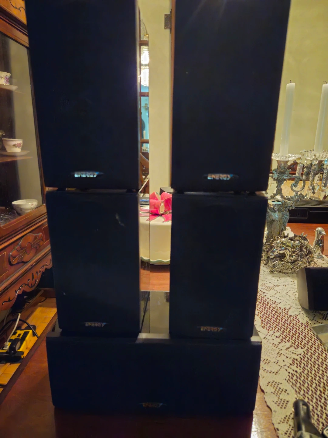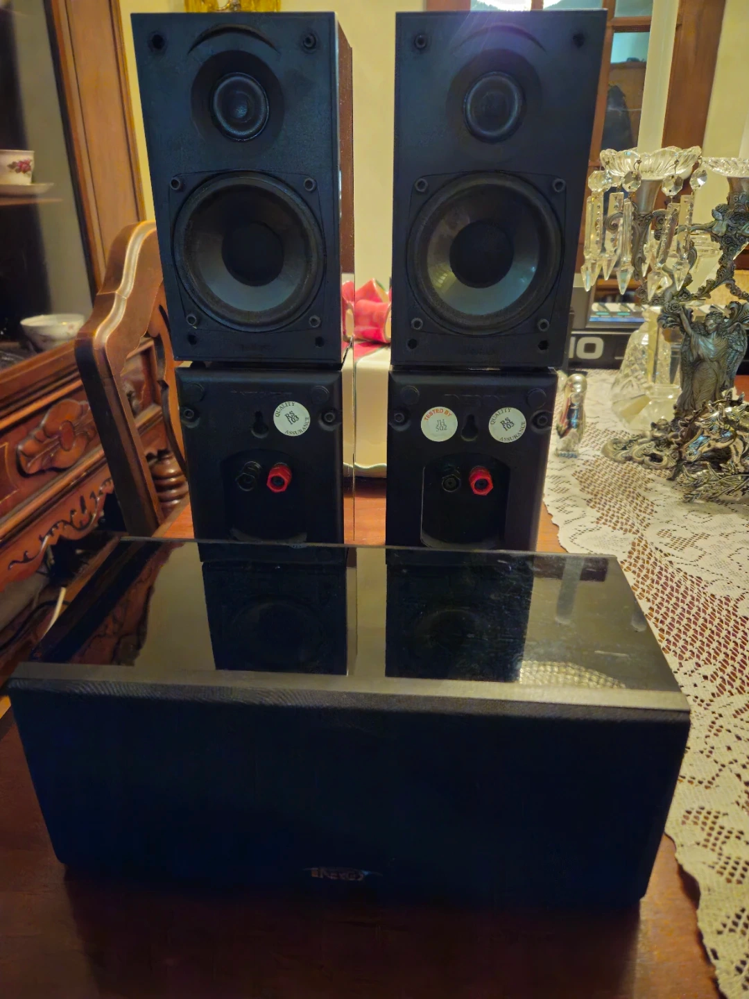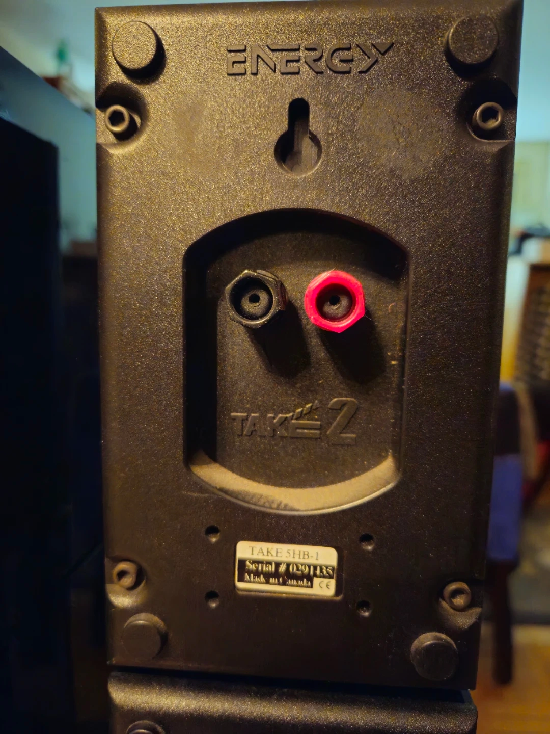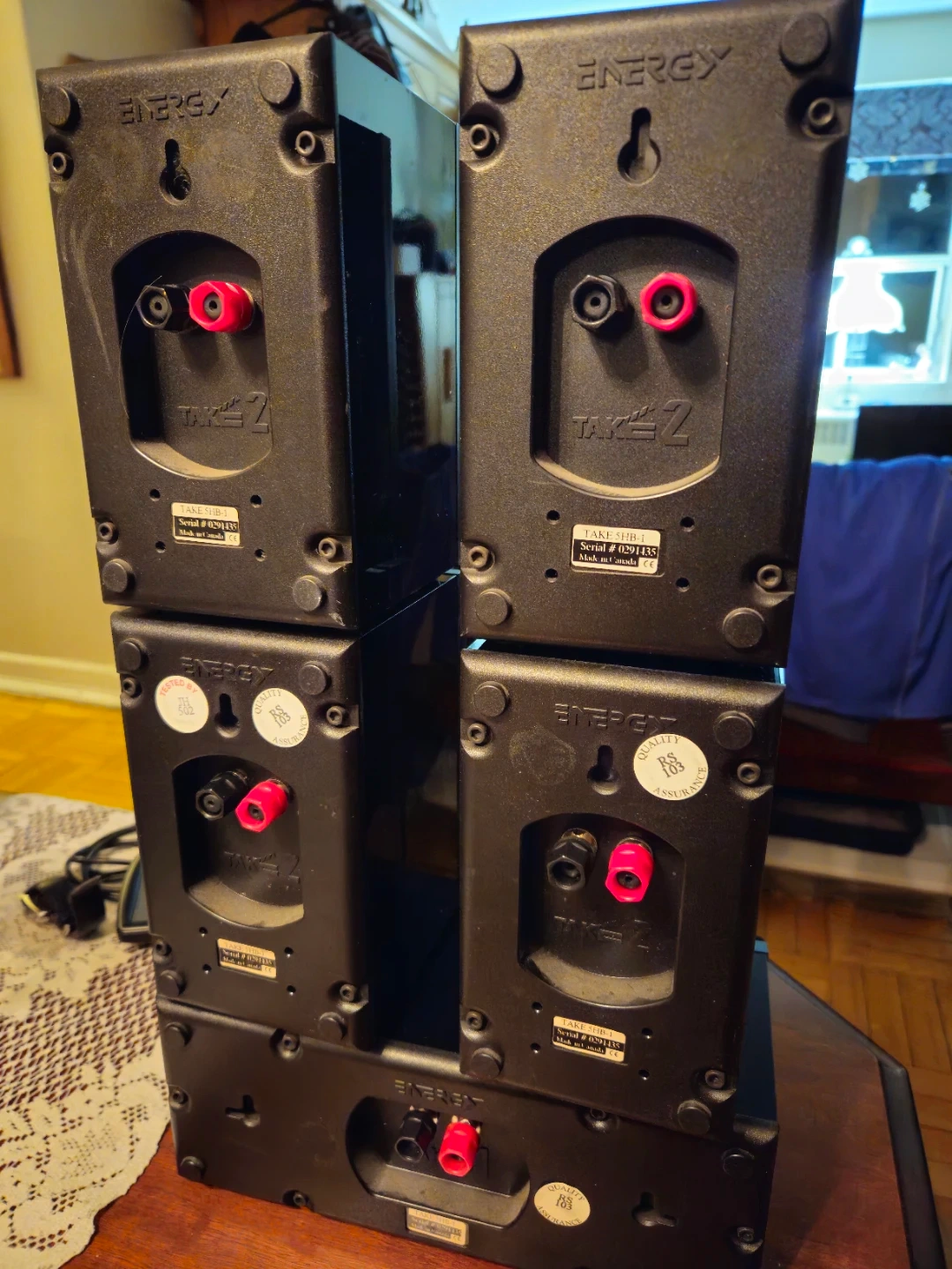 This is a set of Energy Take 5 Series II 5.1 home theatre speakers. They're black and made in Canada. Includes two bookshelf speakers, two surround speakers, and one centre channel speaker.