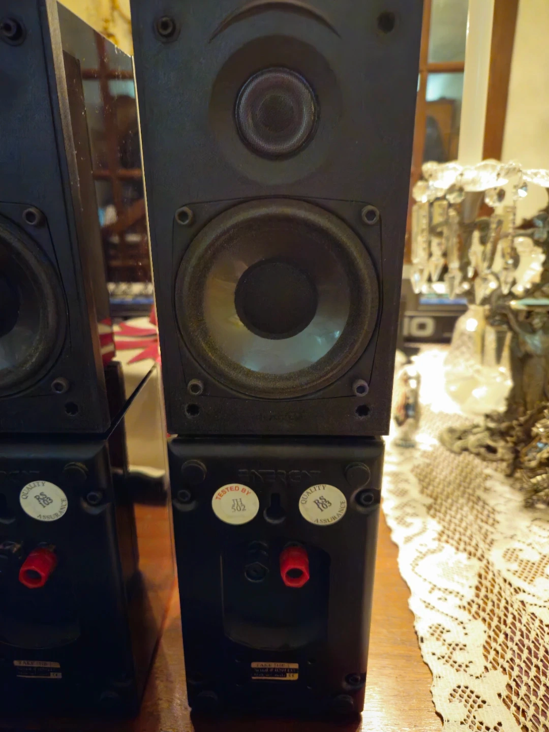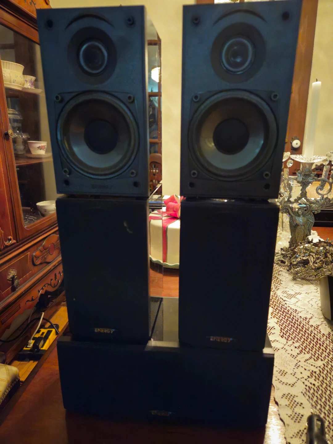 This is a set of Energy Take 5 Series II 5.1 home theatre speakers. They're black and made in Canada. Includes two bookshelf speakers, two surround speakers, and one centre channel speaker.