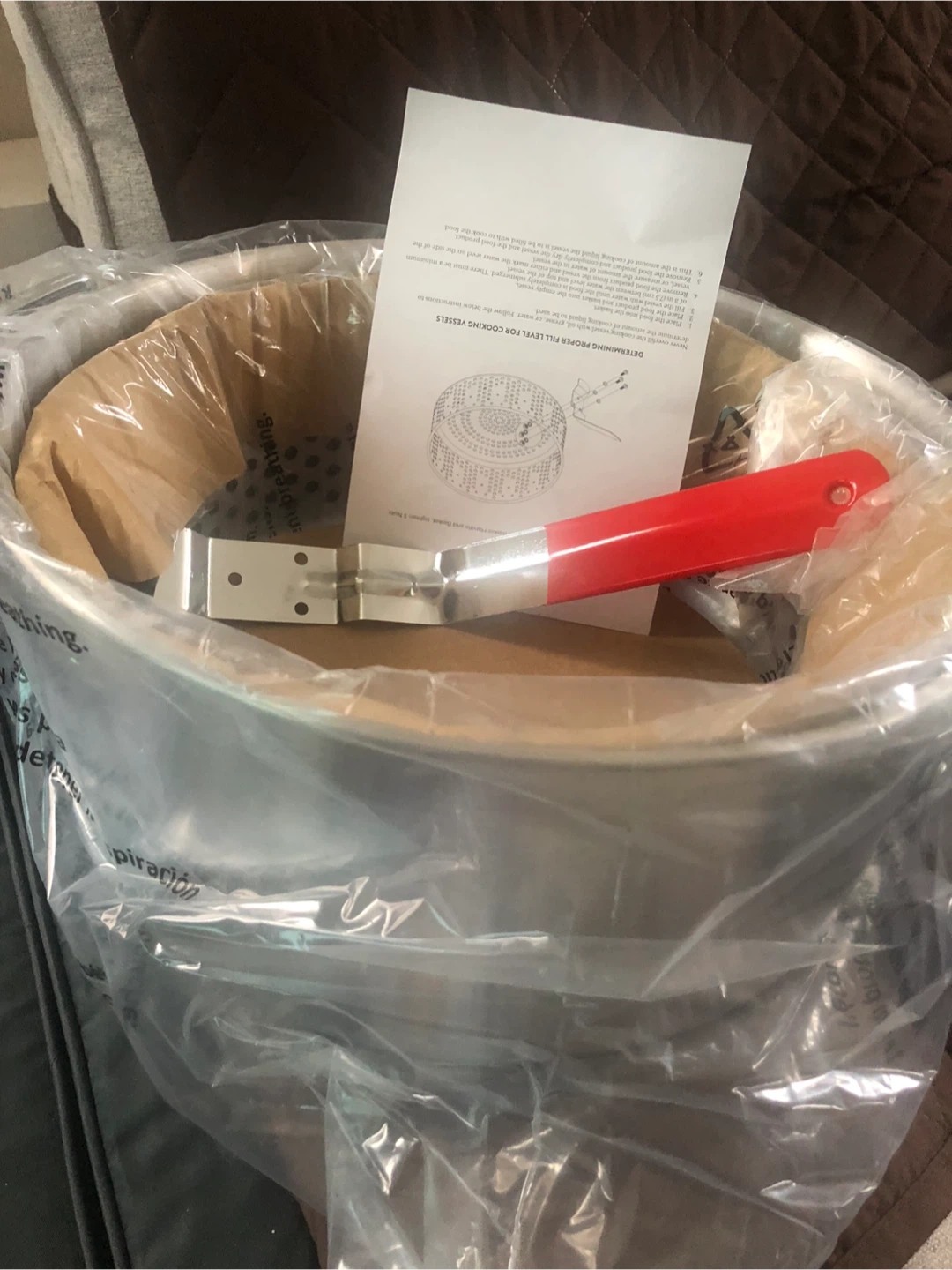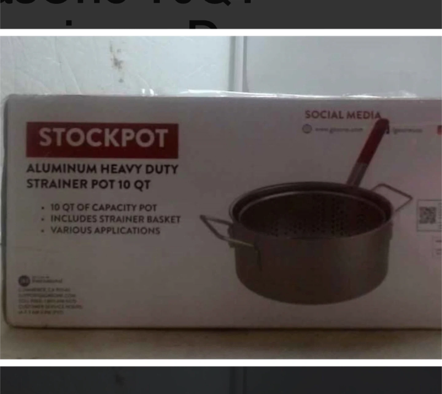 This is an aluminum heavy-duty strainer pot with a 10 qt capacity. It includes a strainer basket and is suitable for various applications. The pot is made of aluminum and has a red handle.