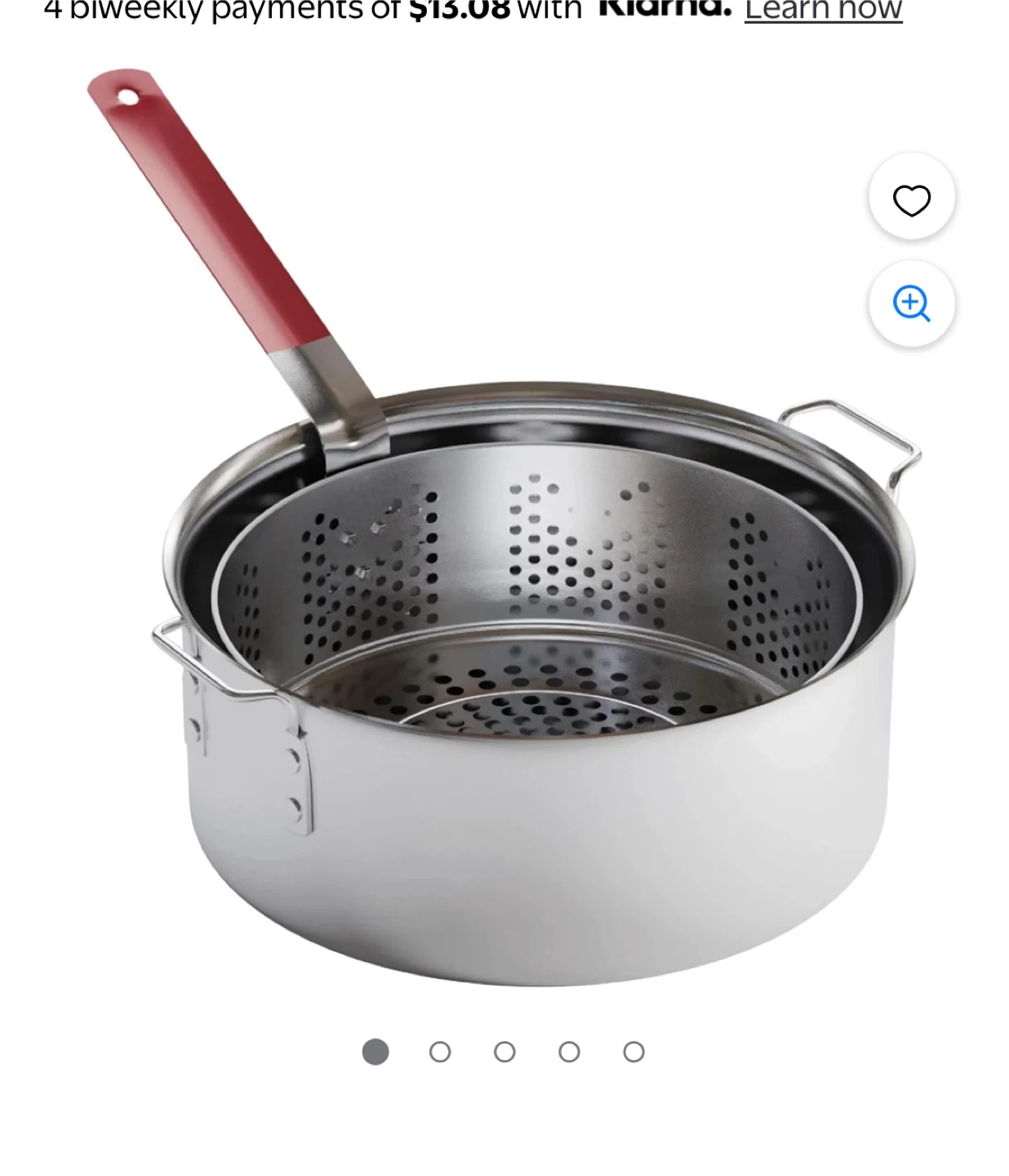This is an aluminum heavy-duty strainer pot with a 10 qt capacity. It includes a strainer basket and is suitable for various applications. The pot is made of aluminum and has a red handle.