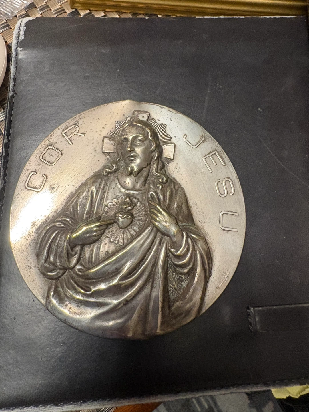 This is a vintage plaque featuring the Sacred Heart of Jesus. It's made of metal and has a circular design with raised relief. The inscription reads 'Cor Jesu'. 5” round