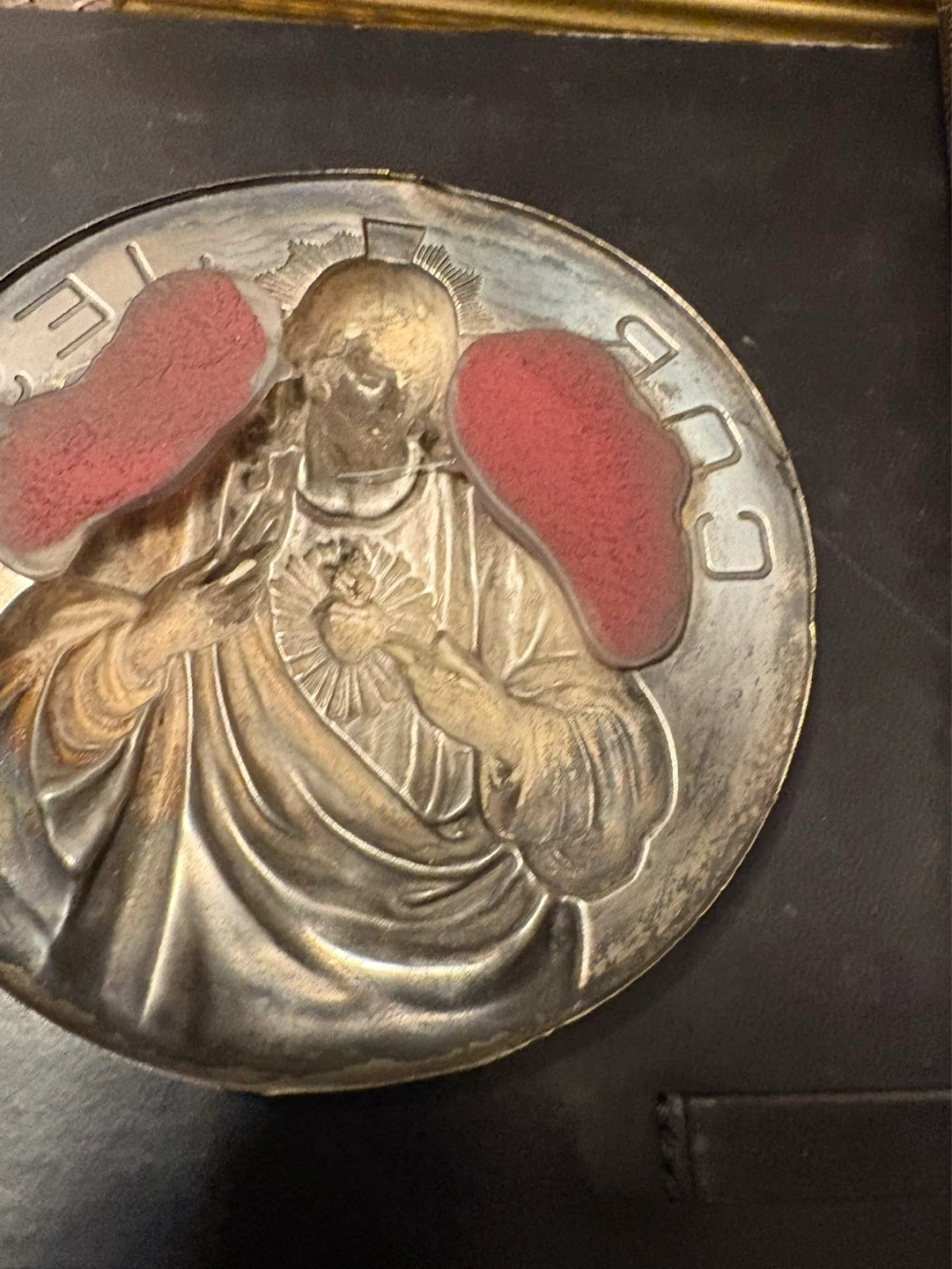 This is a vintage plaque featuring the Sacred Heart of Jesus. It's made of metal and has a circular design with raised relief. The inscription reads 'Cor Jesu'. 5” round