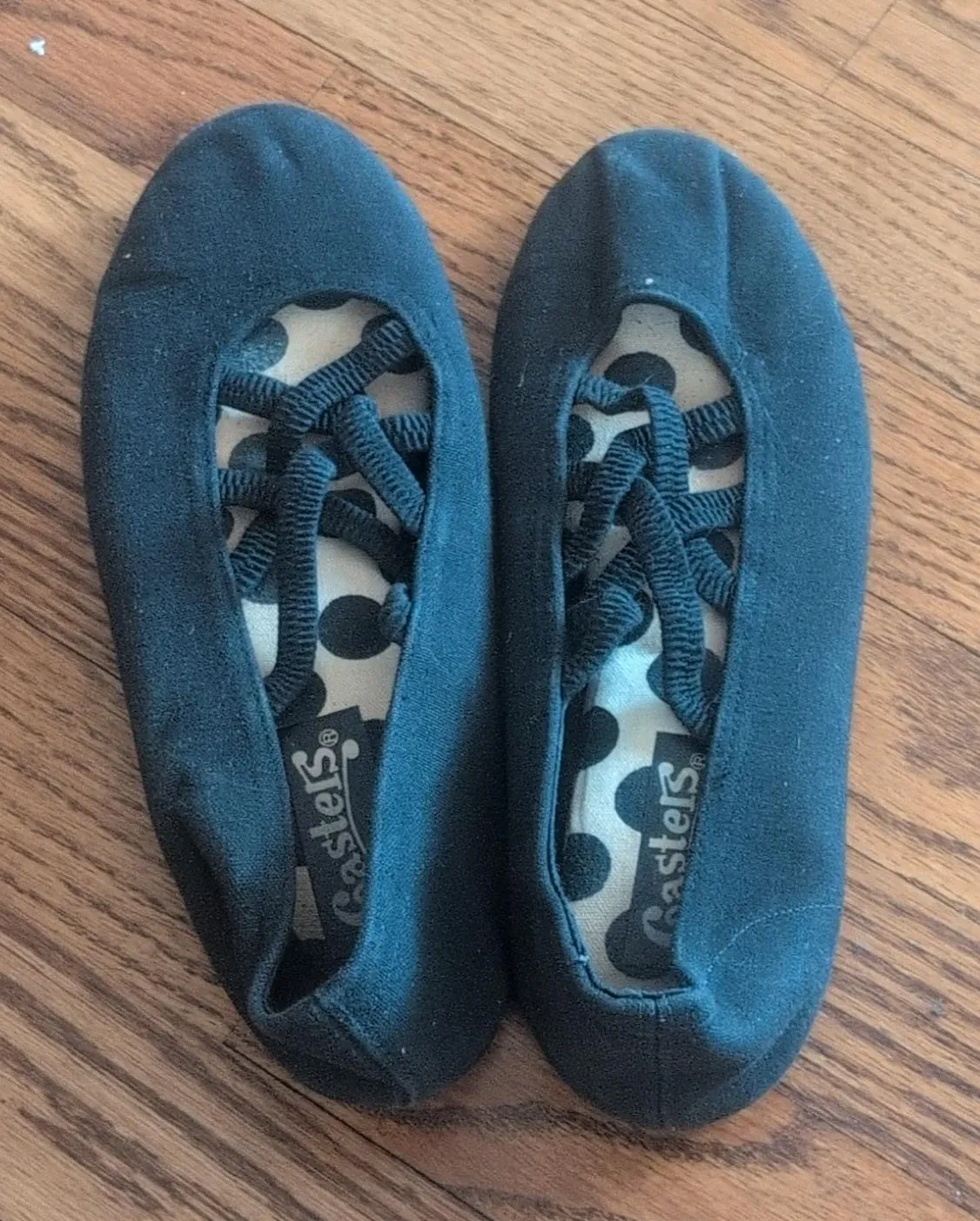 Black ballet shoes by Gasters. These shoes have a polka dot inner lining and criss-cross lacing detail at the top. Fabric construction.
