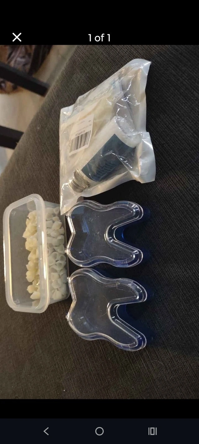 Brighten your smile with this teeth repair kit. It includes a container of whitening tabs, whitening gel, and a mold for your teeth. This kit is used but has lots of life left! I'm decluttering my space and hoping this kit finds a new home where it will be put to good use. If you're seeing this ad, the whitening kit is still available, ready to help you achieve a dazzling smile!