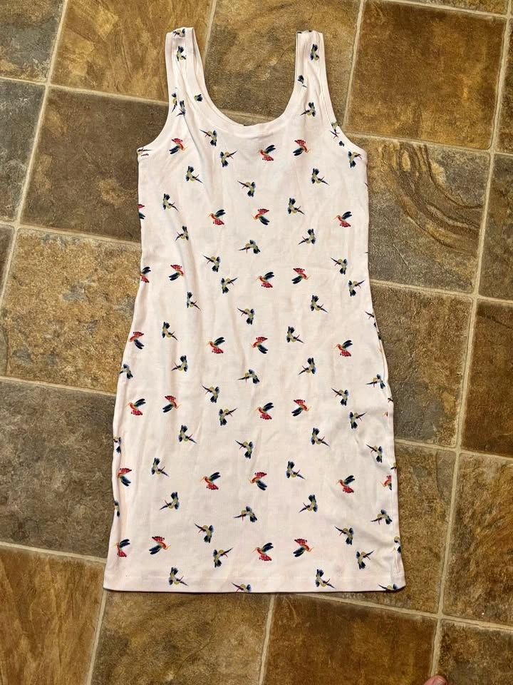 Ribbed tank dress with a cute hummingbird print. Made from a soft cotton blend with a bit of stretch (58% Cotton, 38% Poly, 4% Spandex). Feel free to message if you have any questions!