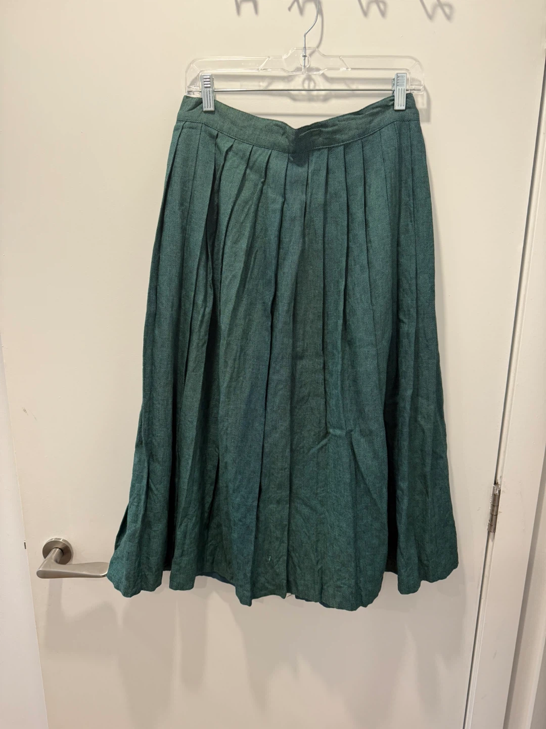 Here's a lovely green pleated skirt! It's in great condition and ready for a new home. The skirt has a nice texture and a classic pleated design. Perfect for adding a touch of elegance to your wardrobe!