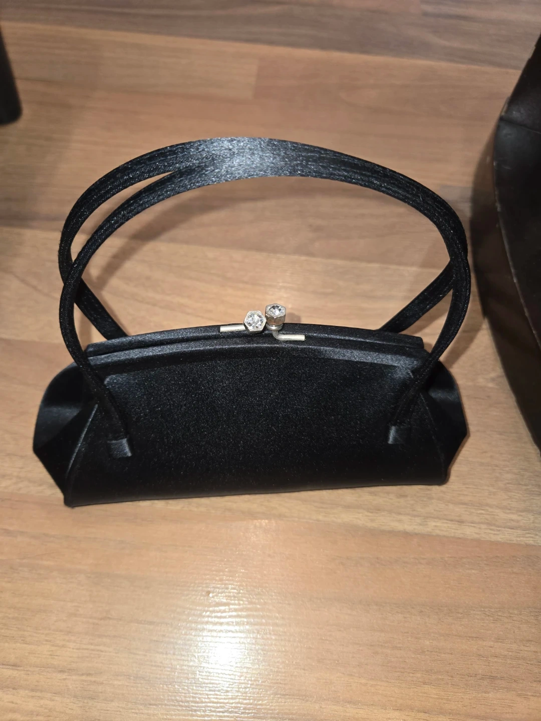 Black satin evening clutch with rhinestone clasp
