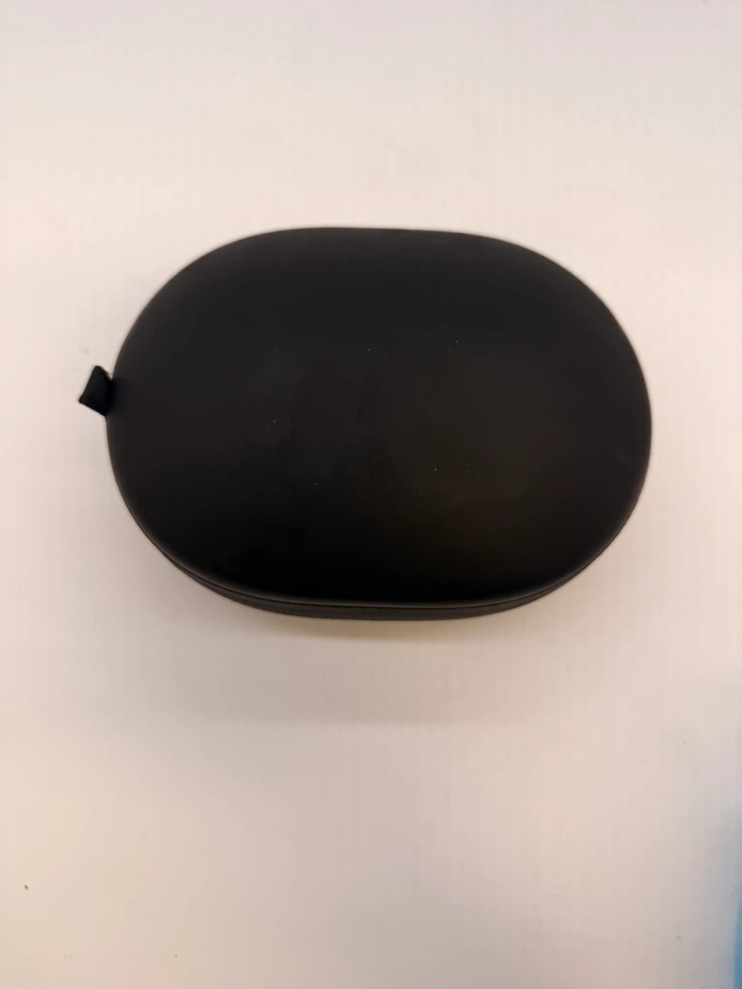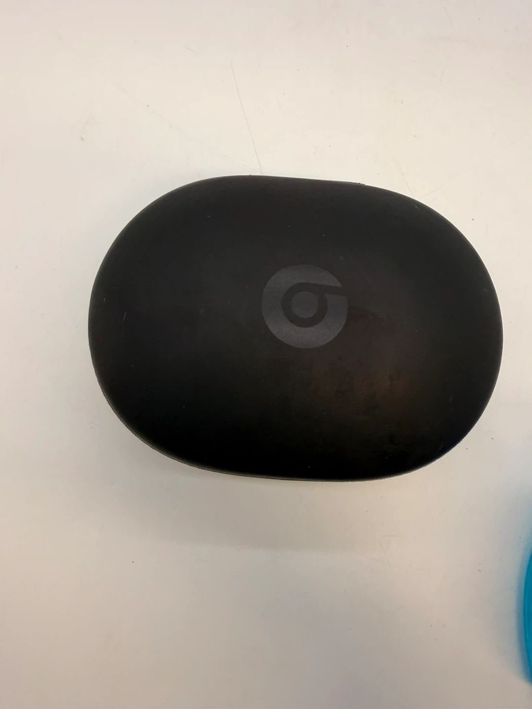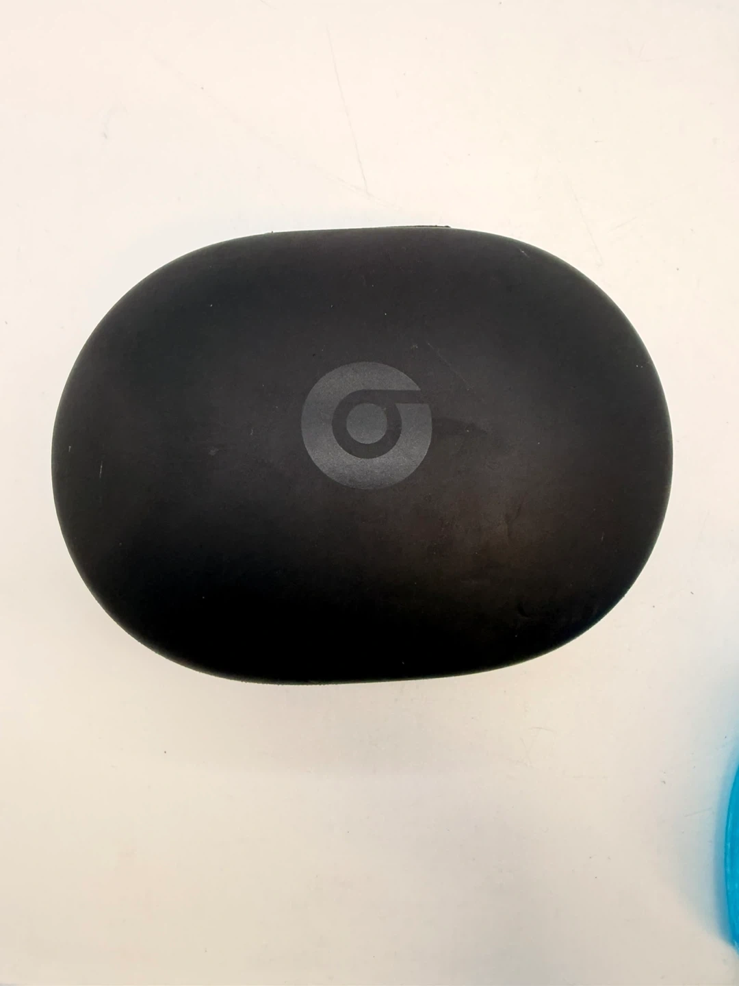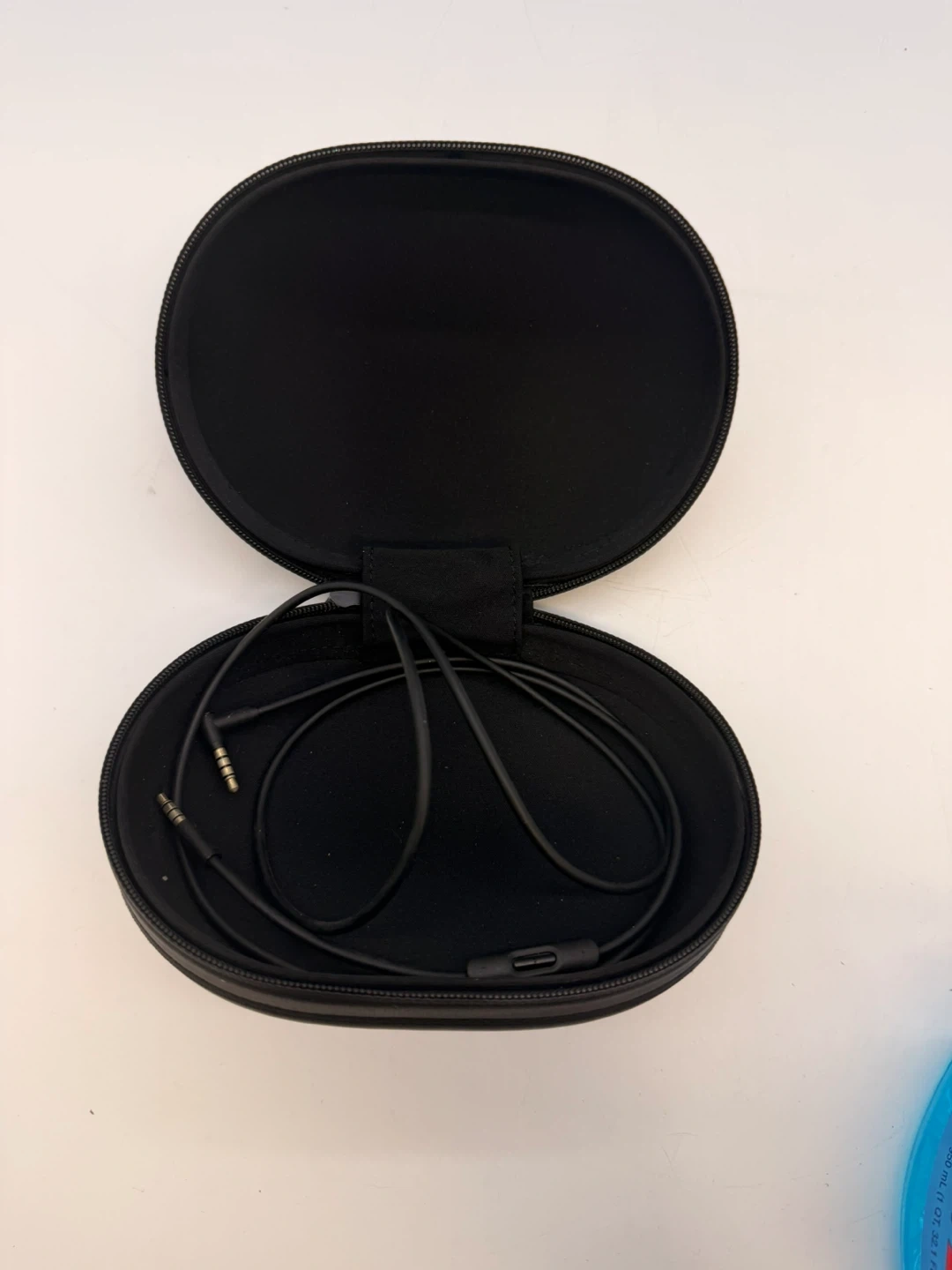 This is a black carrying case for Beats By Dre headphones. It's hard-shelled and oval-shaped, perfect for protecting your headphones. It includes a black audio cable. This case is great for travel or just keeping your headphones tidy!