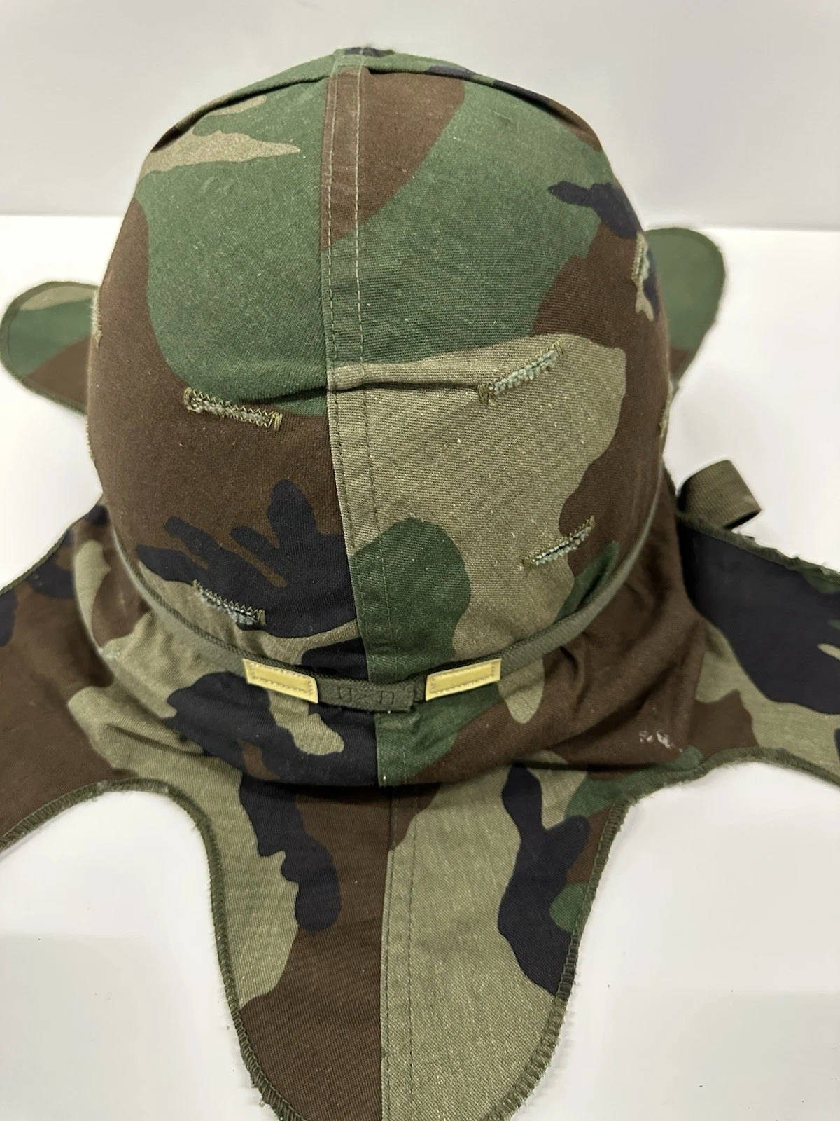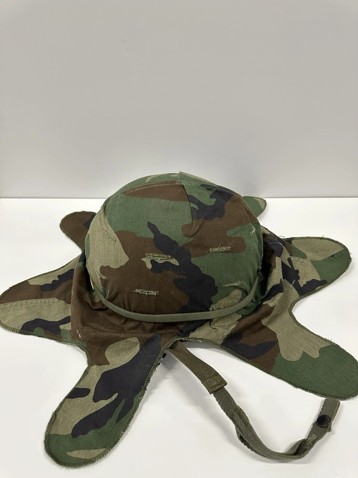 Original US Army M1 steel helmet with woodland camouflage cover.