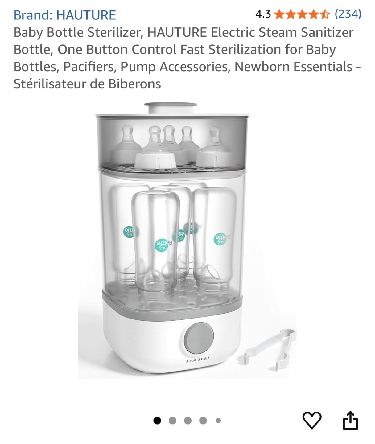 HAUTURE electric steam sanitizer for baby bottles. It features one-button control for fast sterilization of baby bottles, pacifiers, and pump accessories. It's also great for newborn essentials