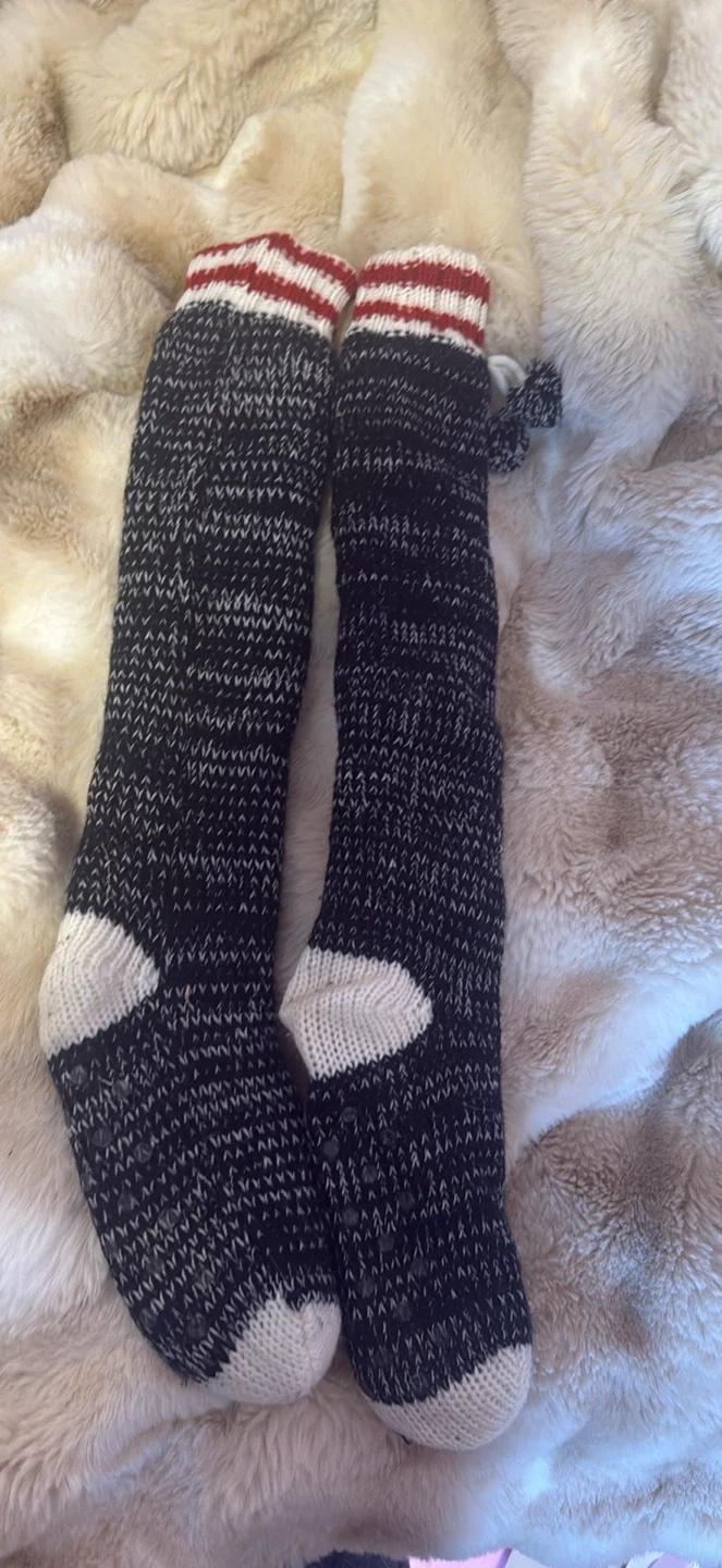Soft and warm knee-high socks with a speckled black and white knit. Features red and white striped cuffs and grippy soles for extra traction. Perfect for lounging or keeping your feet toasty on cooler days!