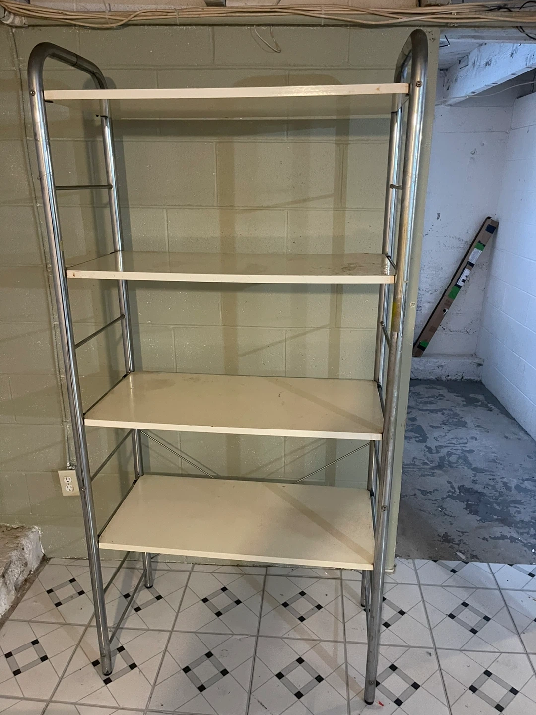 This is a 4-tier shelf unit with a cream-coloured finish on the shelves and a chrome metal frame. It's a great way to organize your belongings. This unit would be useful for storing books, kitchenware, or decorative items.