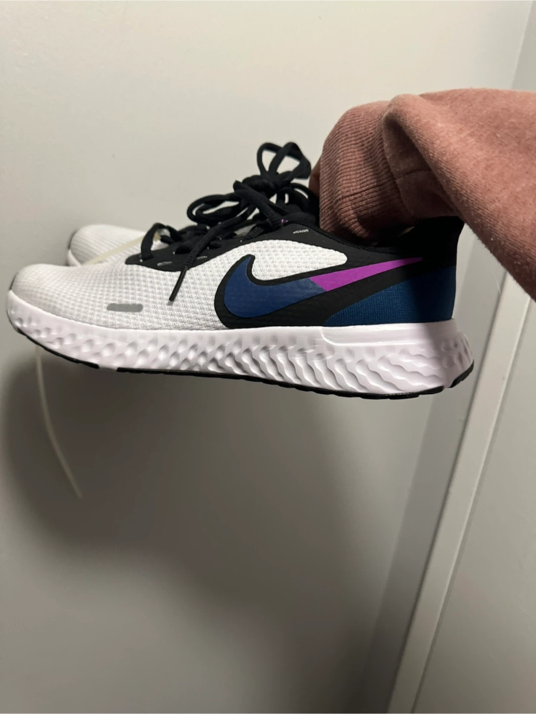Nike running shoes in white, black, and blue. These shoes feature a breathable mesh upper and a durable rubber outsole for traction. Ideal for your daily runs!