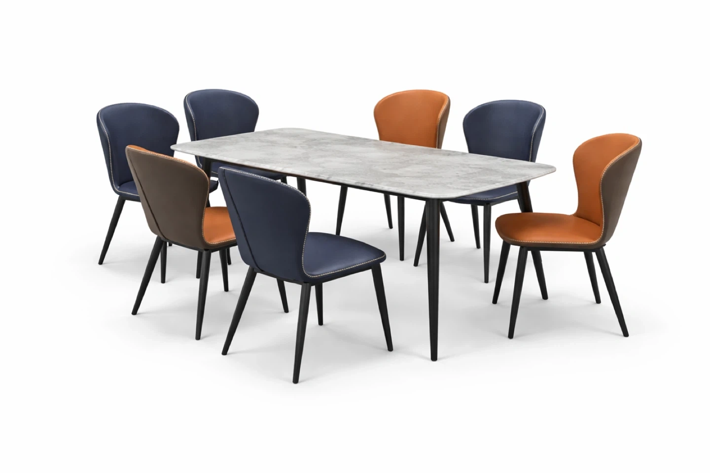 Modern dining table with a ceramic top and six upholstered chairs. Table features a durable ceramic surface and black metal legs. Chairs have a stylish design in navy blue and burnt orange with black legs.