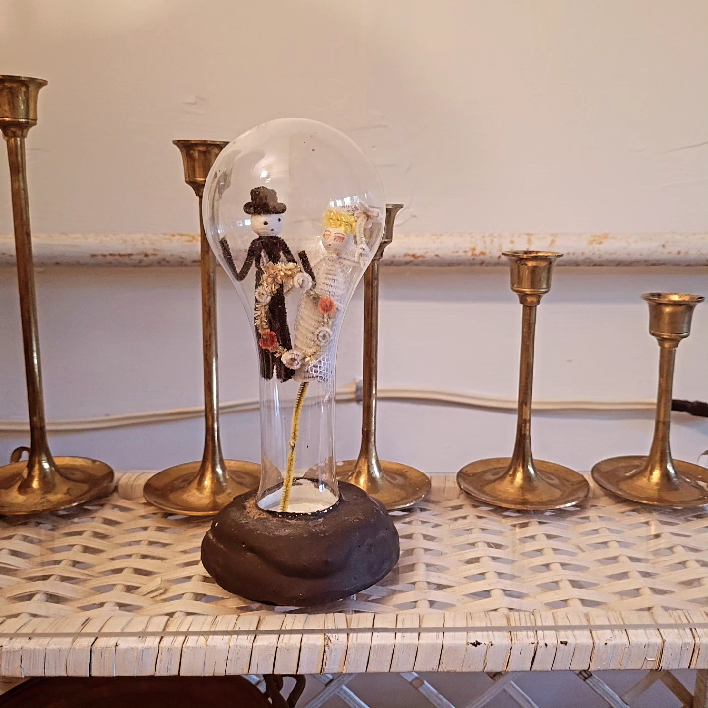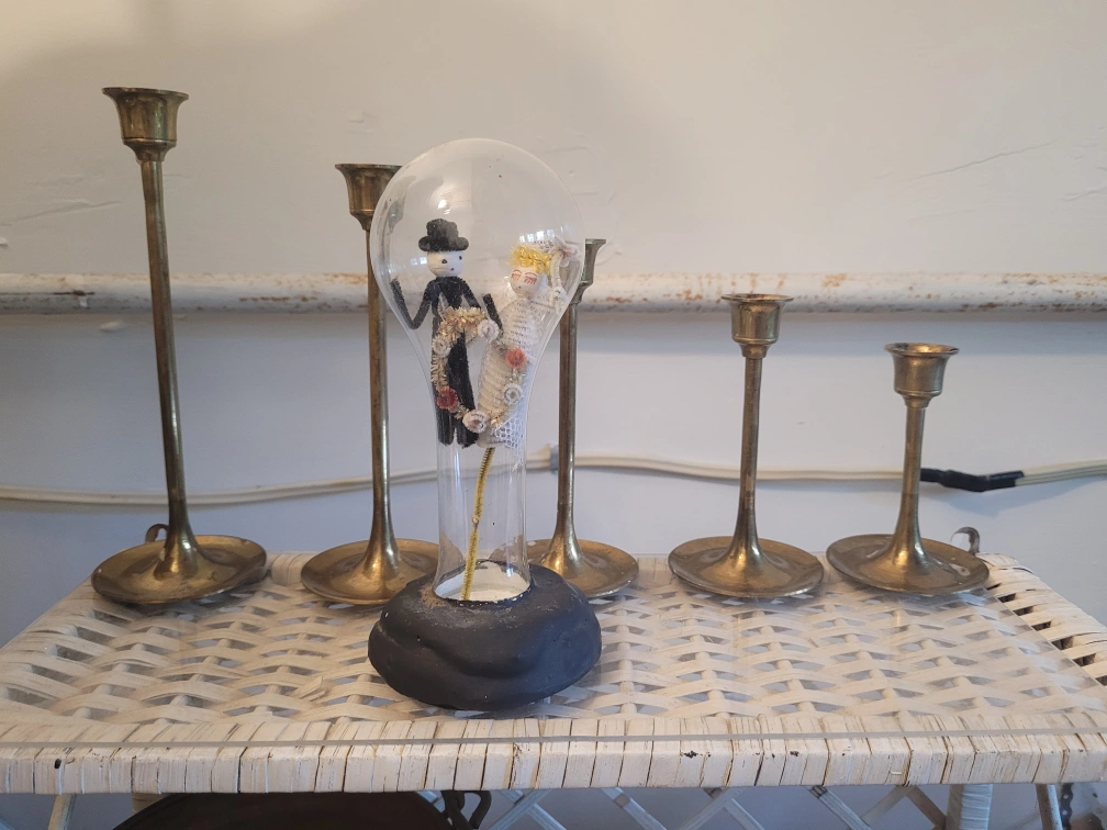 unique heavy base with handmade bride and groom inside.