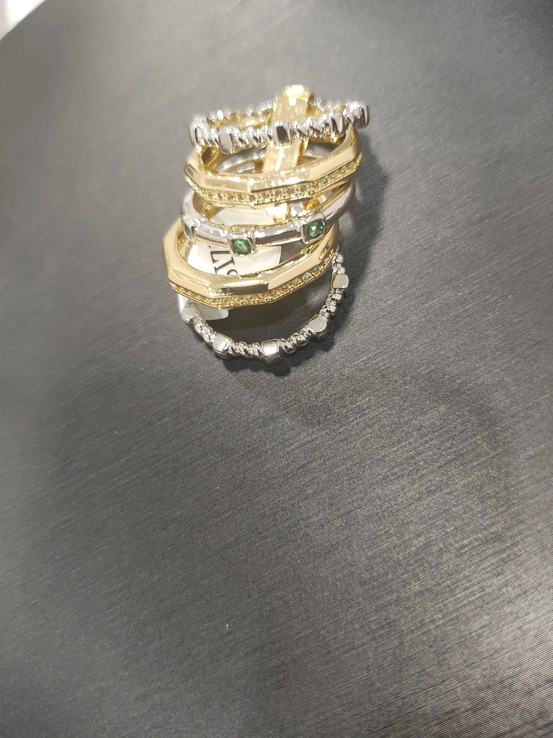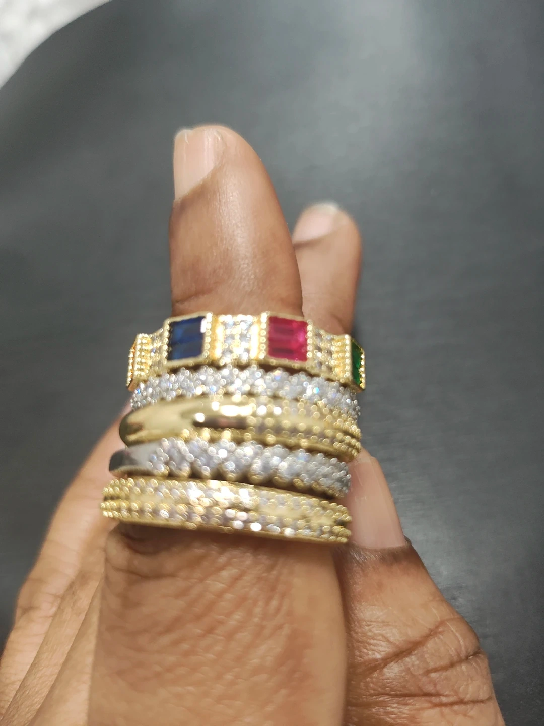 A set of five stackable rings with a mix of gold-tone and silver-tone finishes. Some rings are embellished with small clear stones and others feature colourful square-cut gems like blue, red, and green. These rings are designed to be worn together or separately for a layered look.