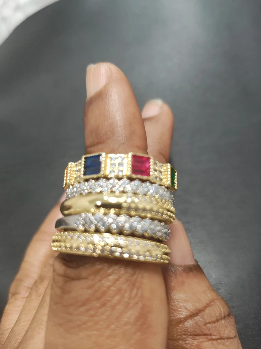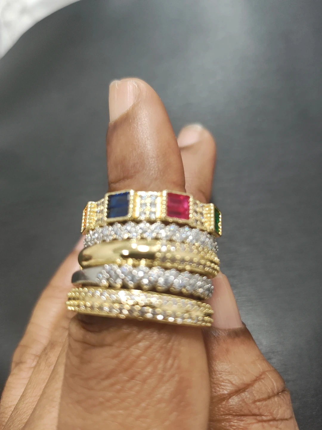 A set of five stackable rings with a mix of gold-tone and silver-tone finishes. Some rings are embellished with small clear stones and others feature colourful square-cut gems like blue, red, and green. These rings are designed to be worn together or separately for a layered look.