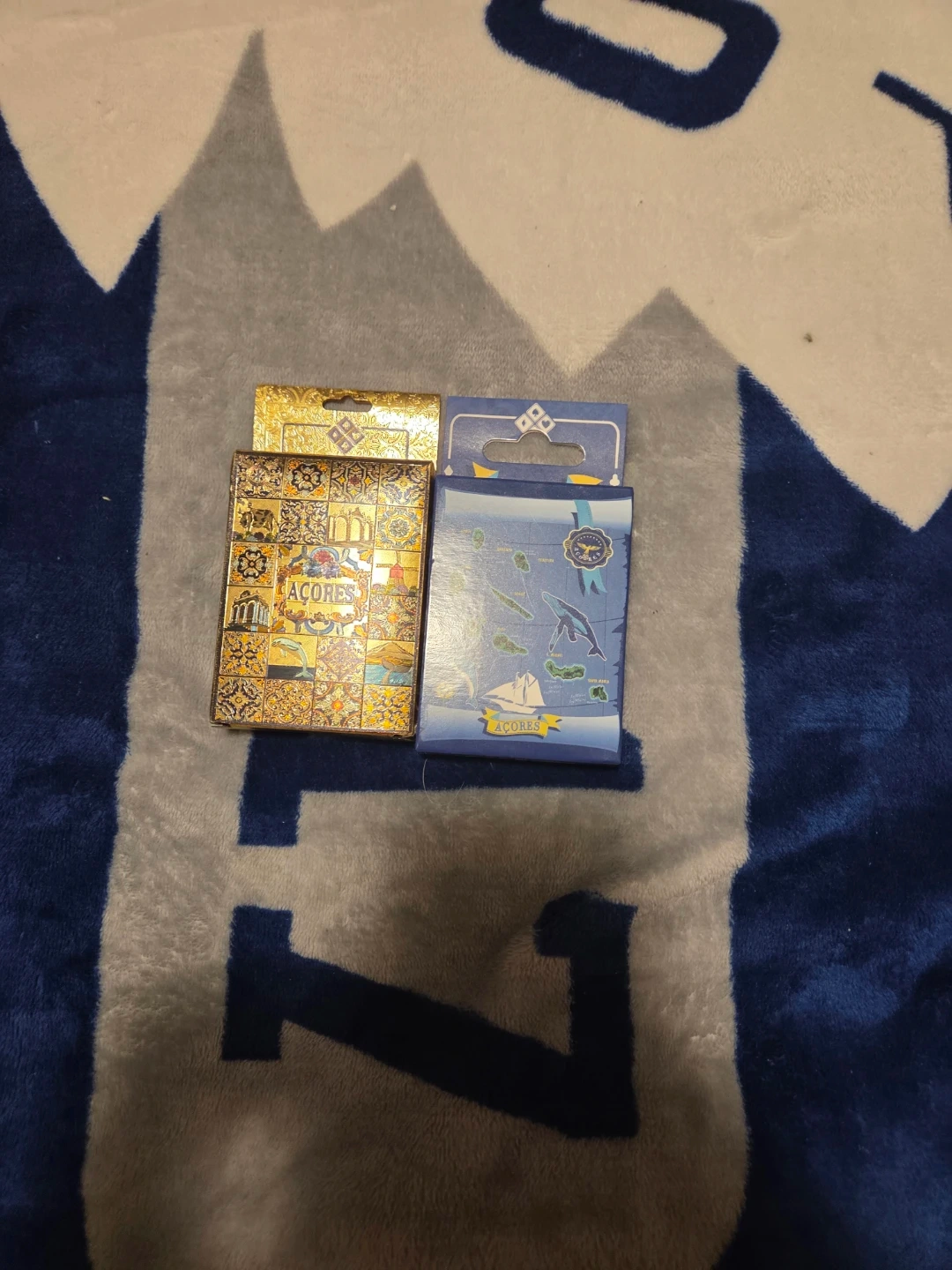 Two decks of Acores playing cards. One deck features a gold-patterned box, and the other has a blue box with a map of the Azores islands and marine life. Great for collectors or a game night!