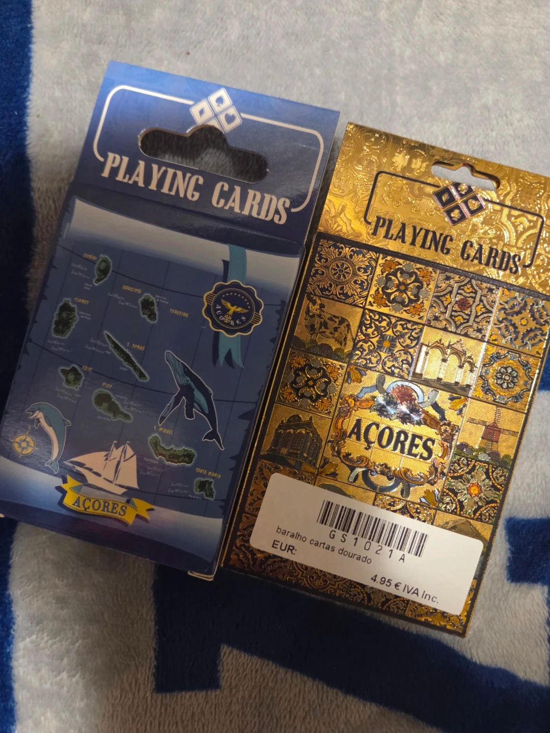 Two decks of Acores playing cards. One deck features a gold-patterned box, and the other has a blue box with a map of the Azores islands and marine life. Great for collectors or a game night!