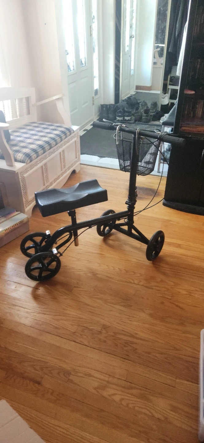 This is a black knee scooter walker with 4 wheels. It includes a detachable basket for convenient storage. This walker offers support for individuals recovering from lower leg or foot injuries.
