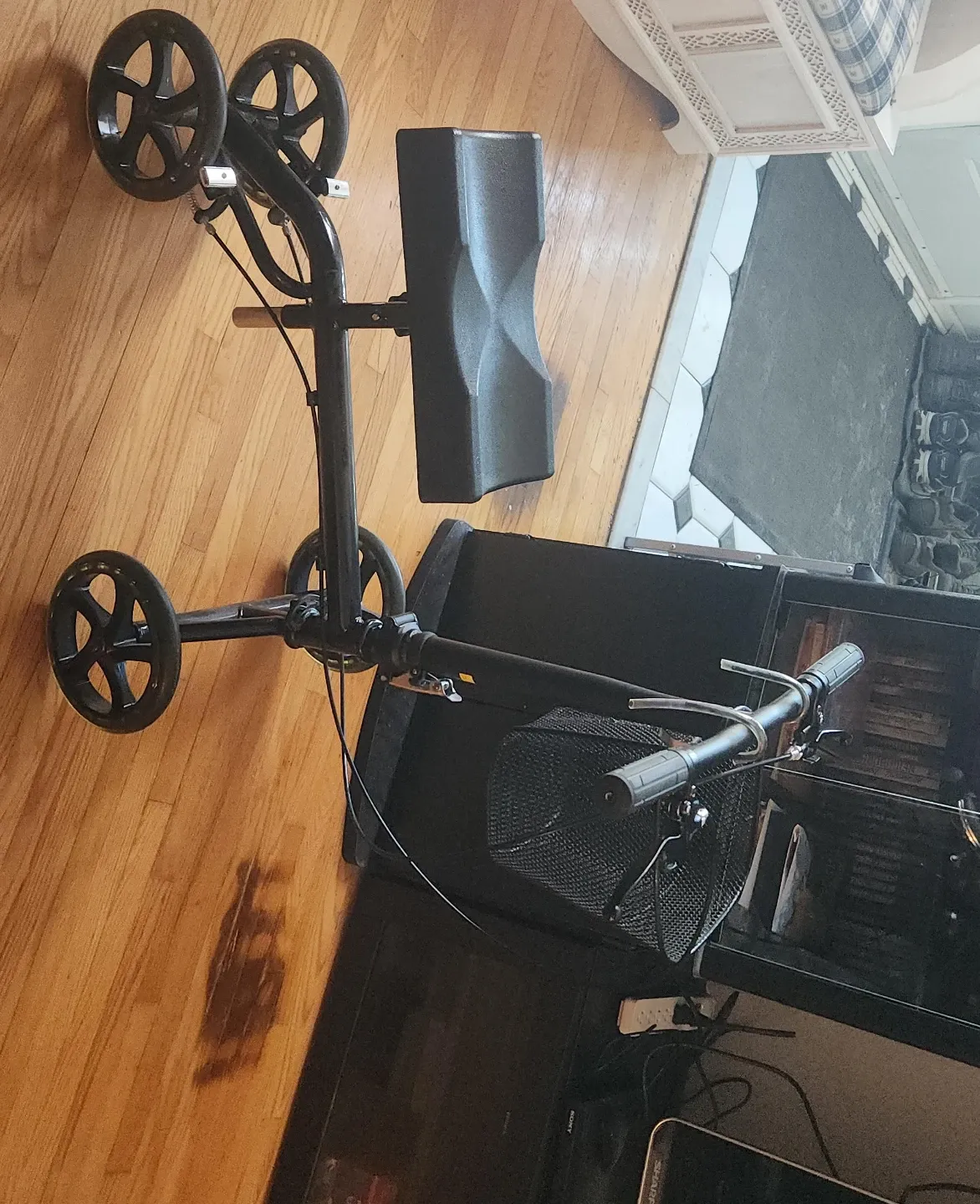 This is a black knee scooter walker with 4 wheels. It includes a detachable basket for convenient storage. This walker offers support for individuals recovering from lower leg or foot injuries.