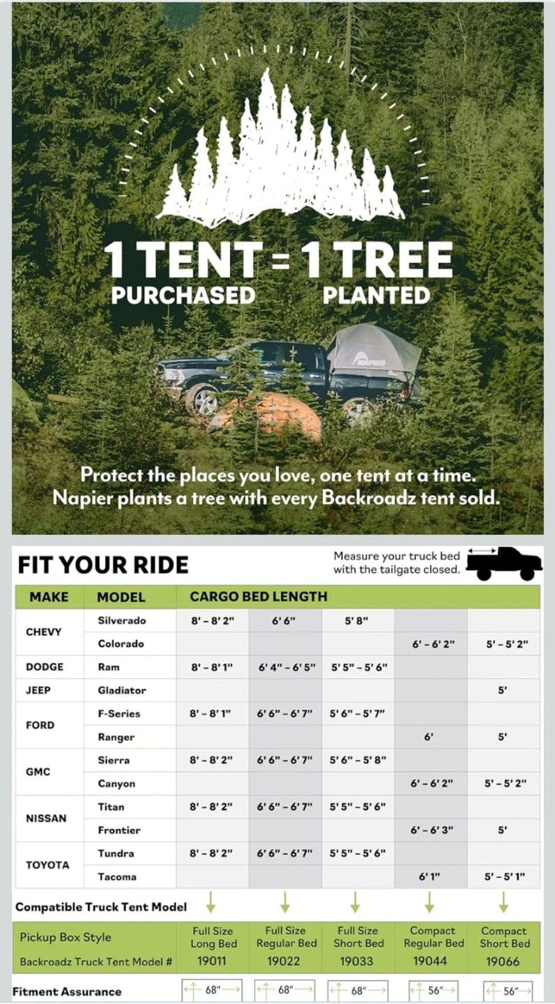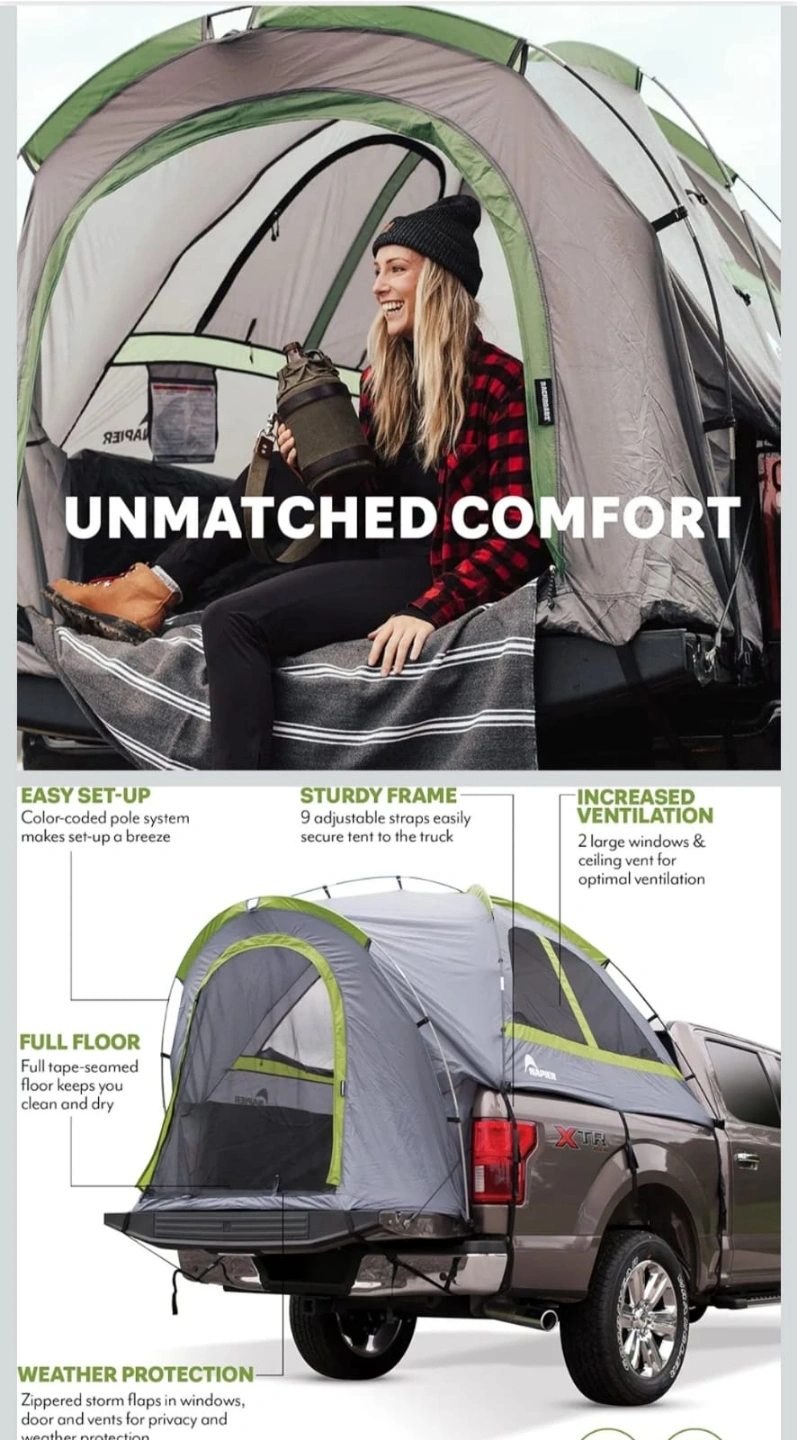 Truck tent, fits various truck bed sizes. Durable polyester taffeta fabric. Easy setup. Sleeps two. Includes features like increased ventilation and weather protection.