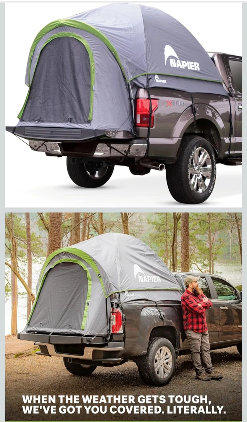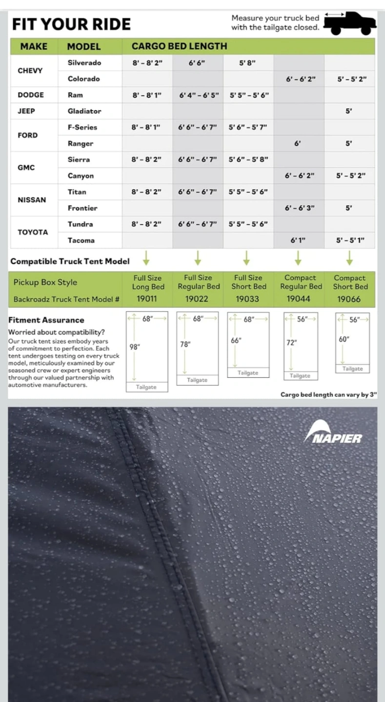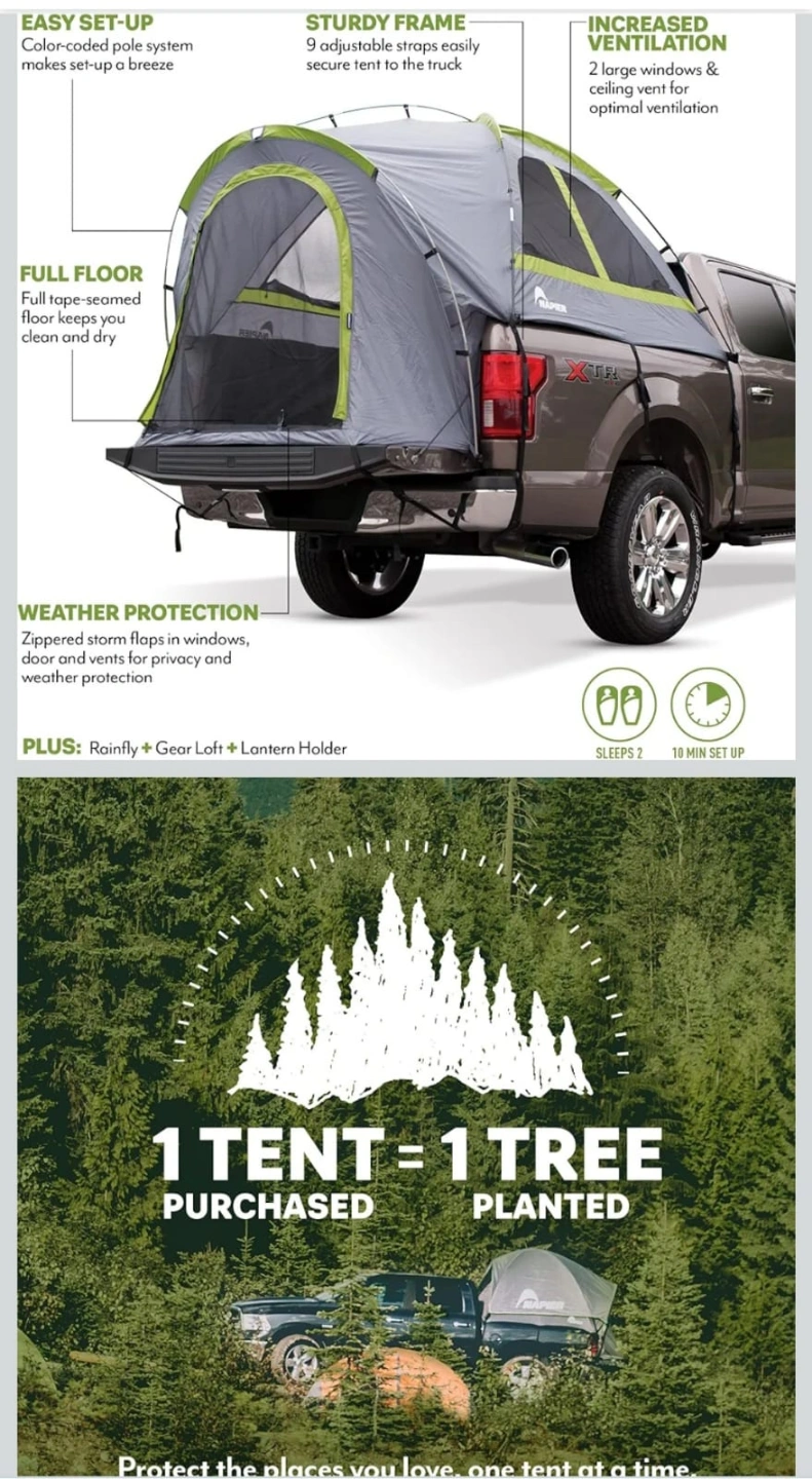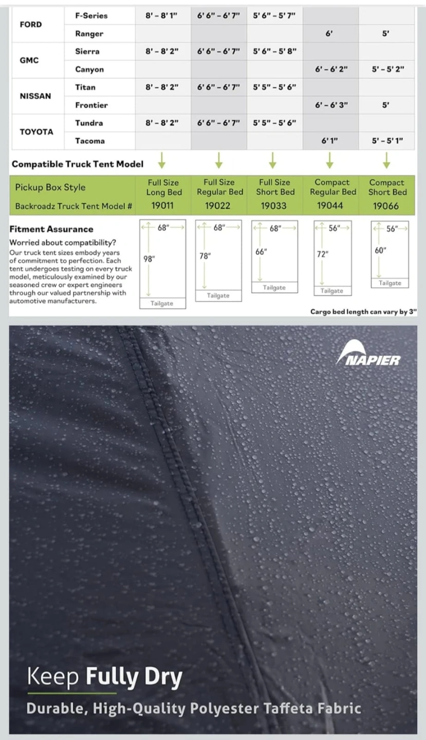Truck tent, fits various truck bed sizes. Durable polyester taffeta fabric. Easy setup. Sleeps two. Includes features like increased ventilation and weather protection.