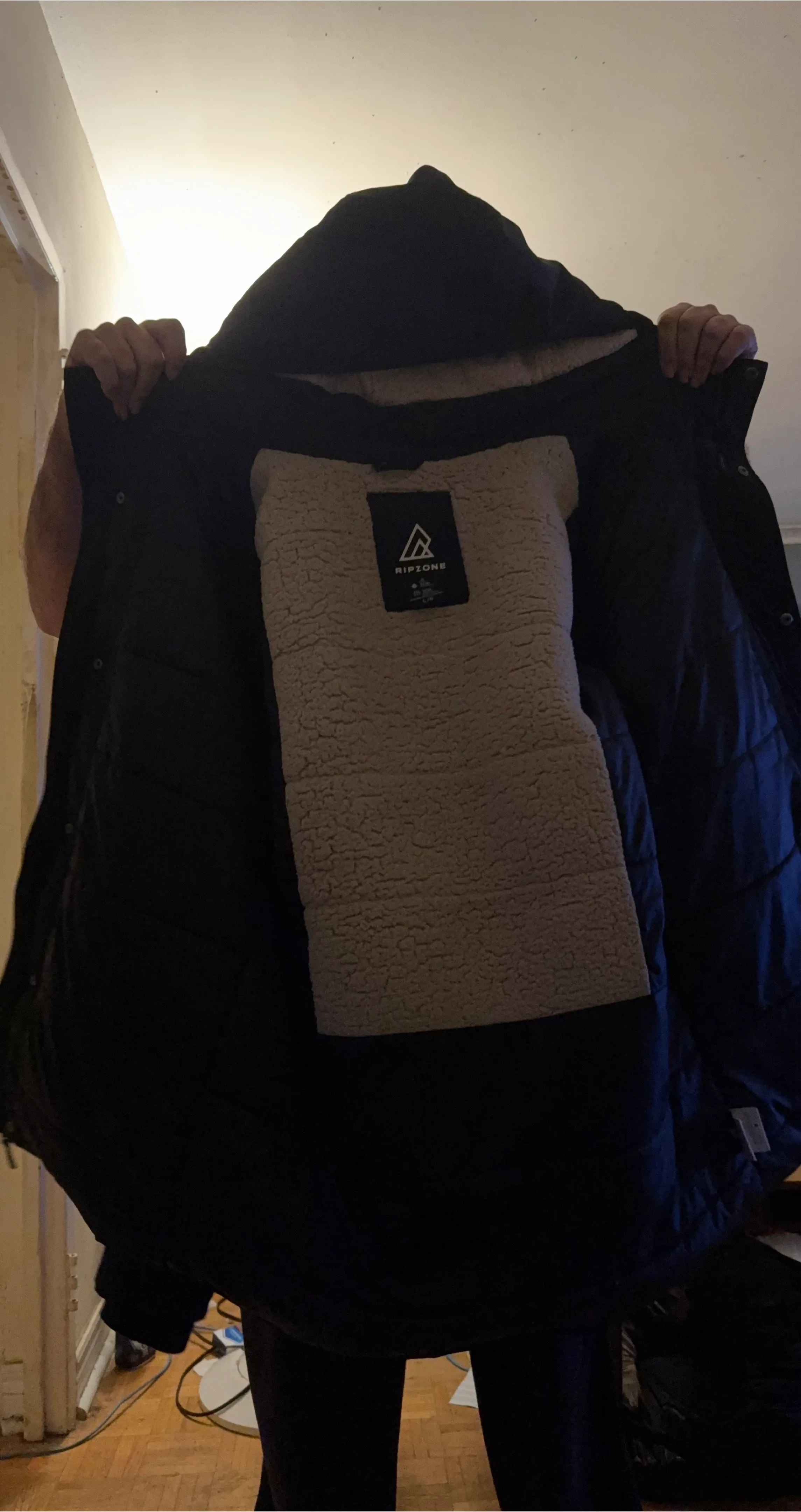 Here's a Ripzone winter jacket in black. It has a cozy sherpa lining to keep you warm on those cold days. The jacket is in good condition and ready for the winter season!