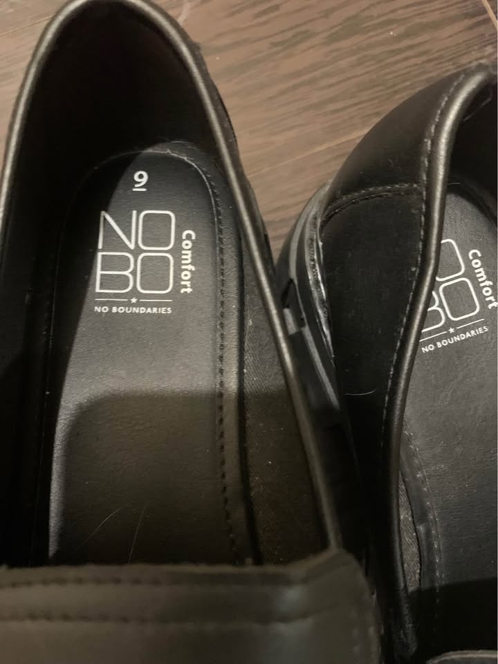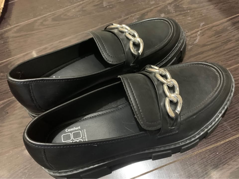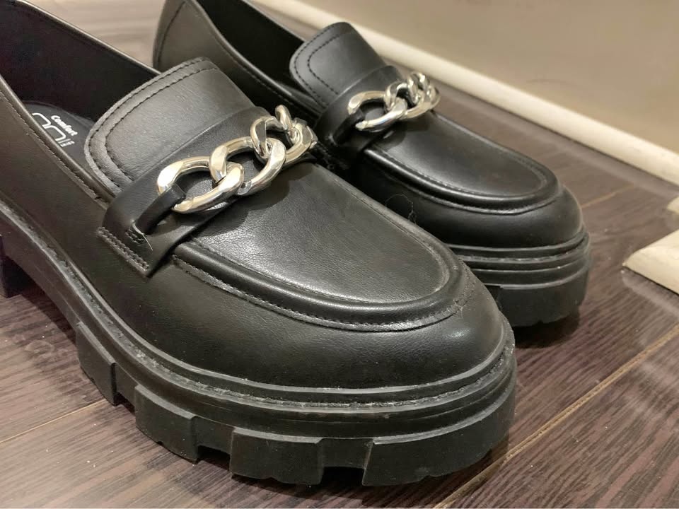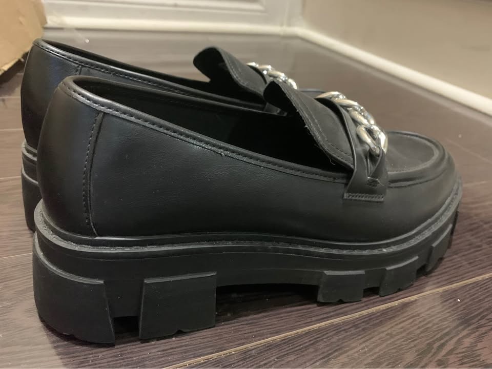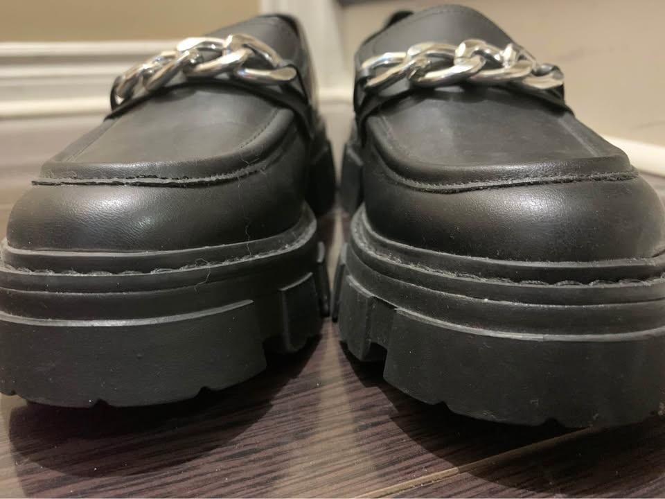 Brand new, never worn outside black faux leather loafers with silver chain detail. Size is visible on the insole. They have thick, heavy chunky soles. There are some minor scratches on the leather. Pickup at Chingacousy & Williams in Brampton.