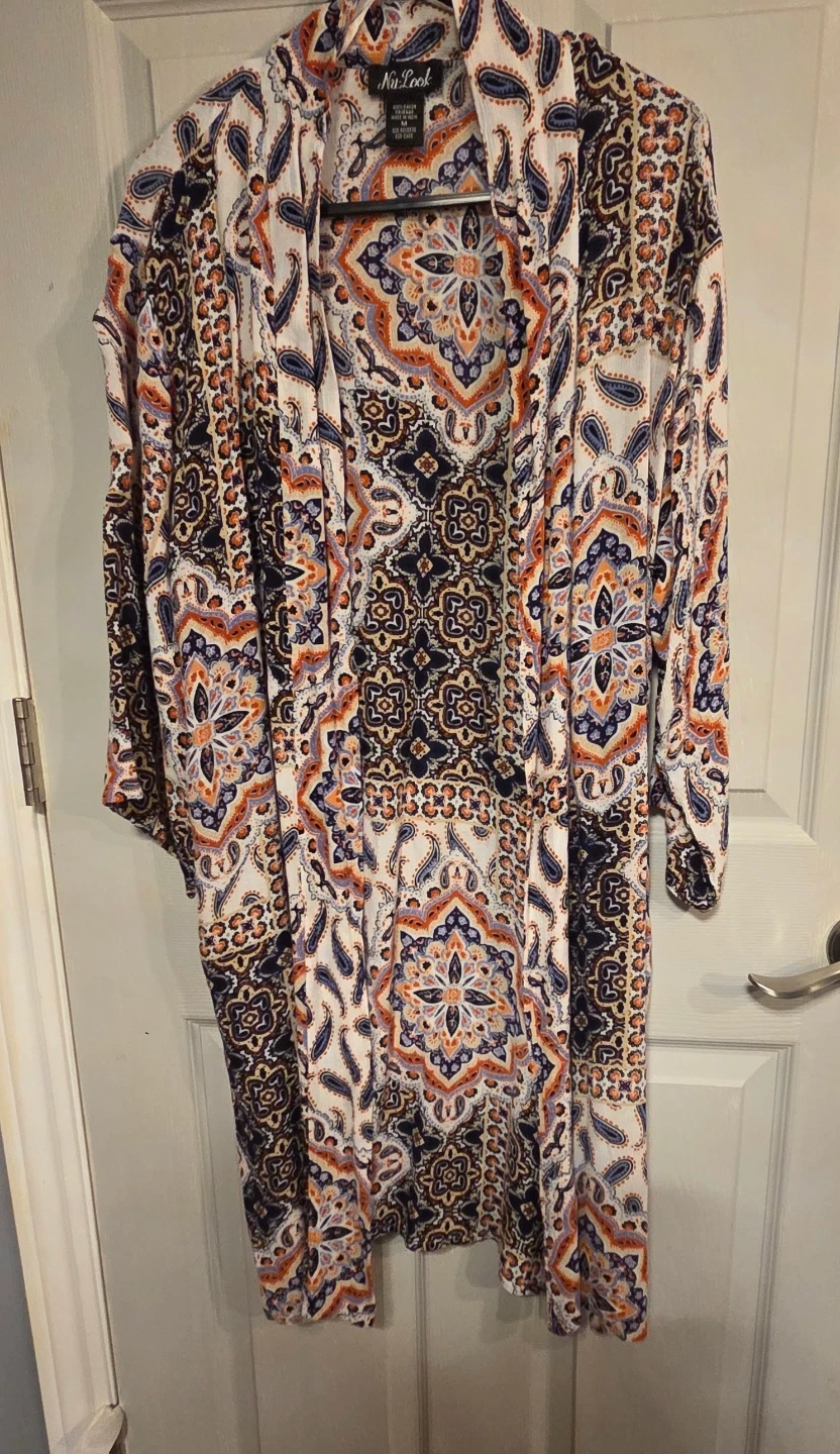 This is a Nu Look women's kimono cardigan. It's a size medium with a bold, colourful paisley and mandala print. The fabric appears to be a soft, lightweight blend, perfect for layering.