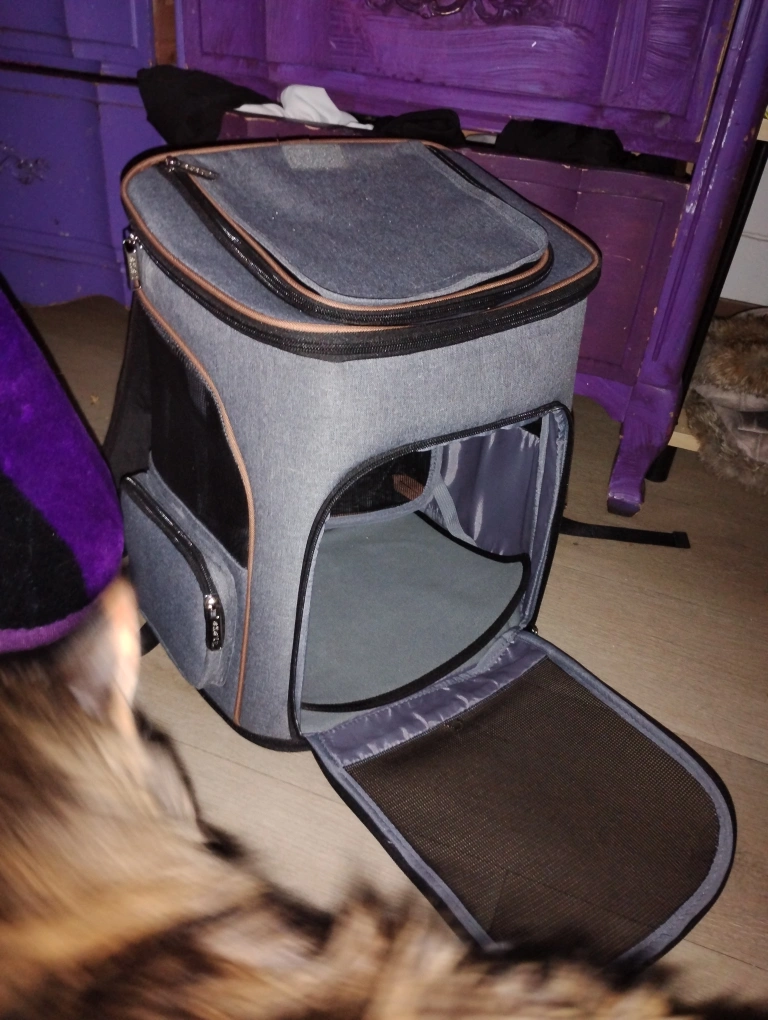 Grey pet carrier backpack with mesh windows. Has multiple pockets and a handle. Can be worn as a backpack or carried.
