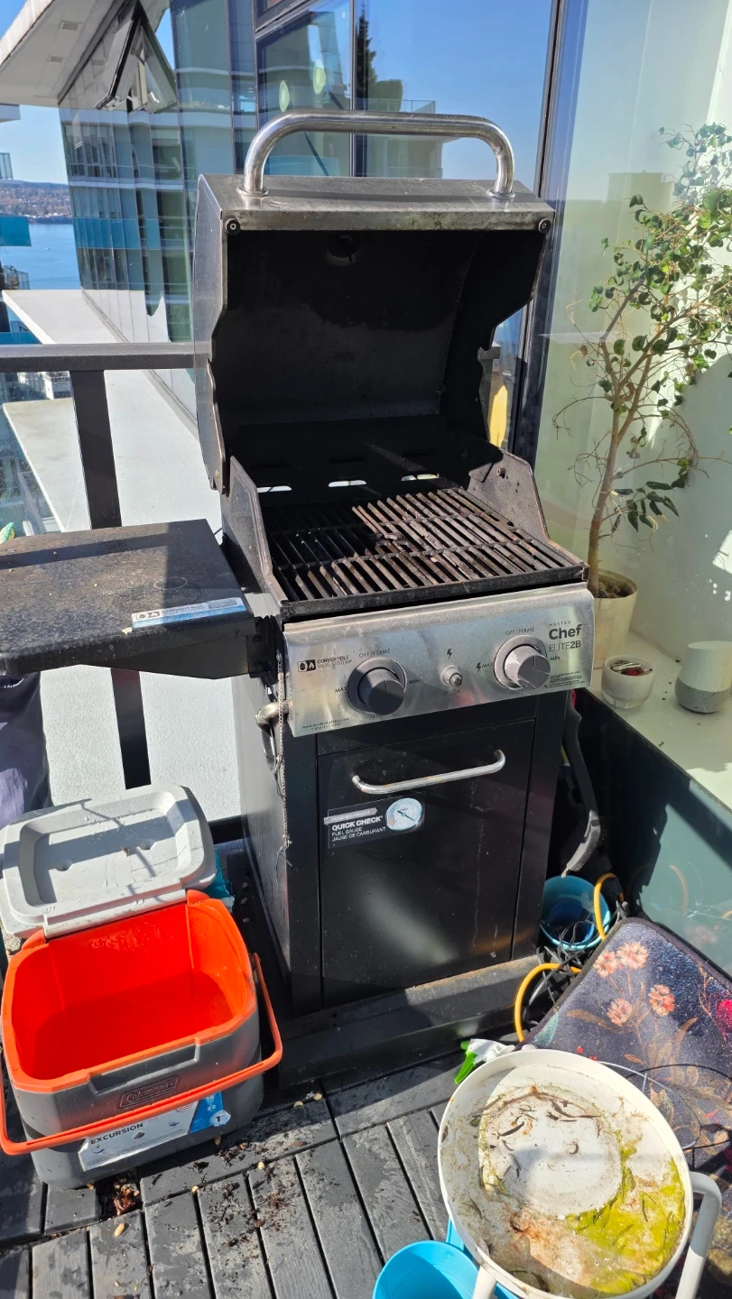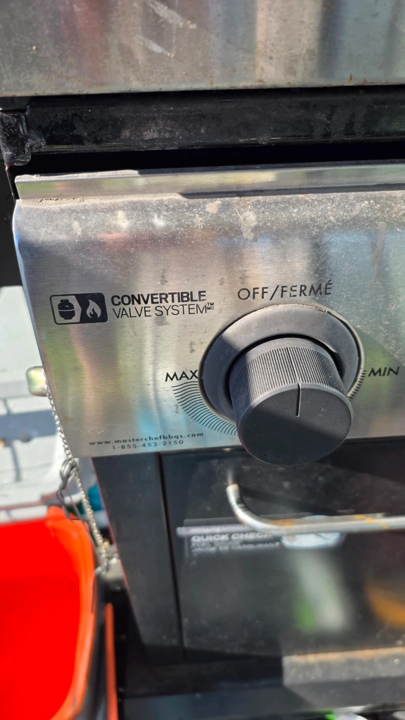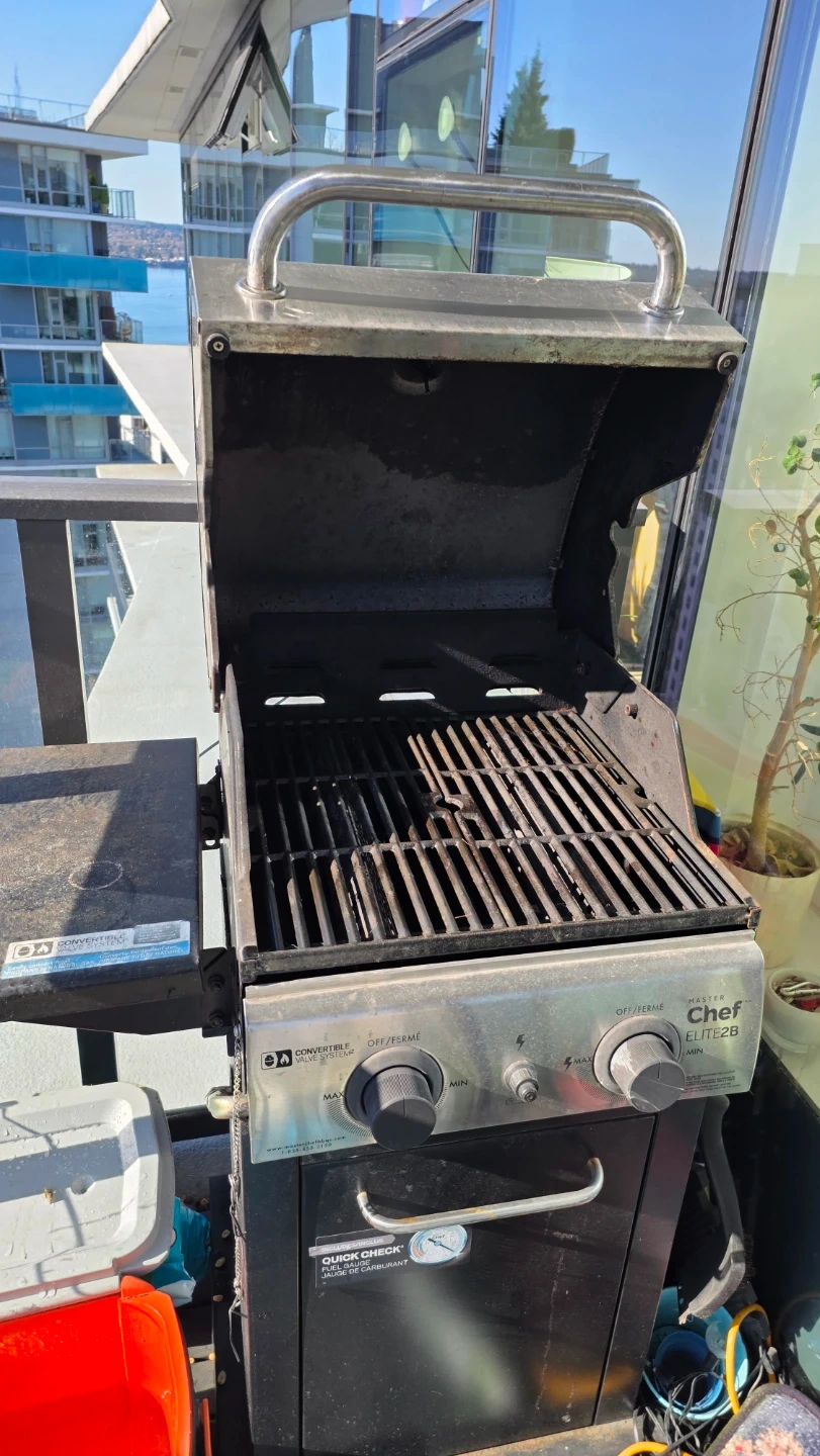 Master Chef Elite 2B propane BBQ. Features a convertible valve system and side shelf. It's great for cooking up a storm outdoors!
