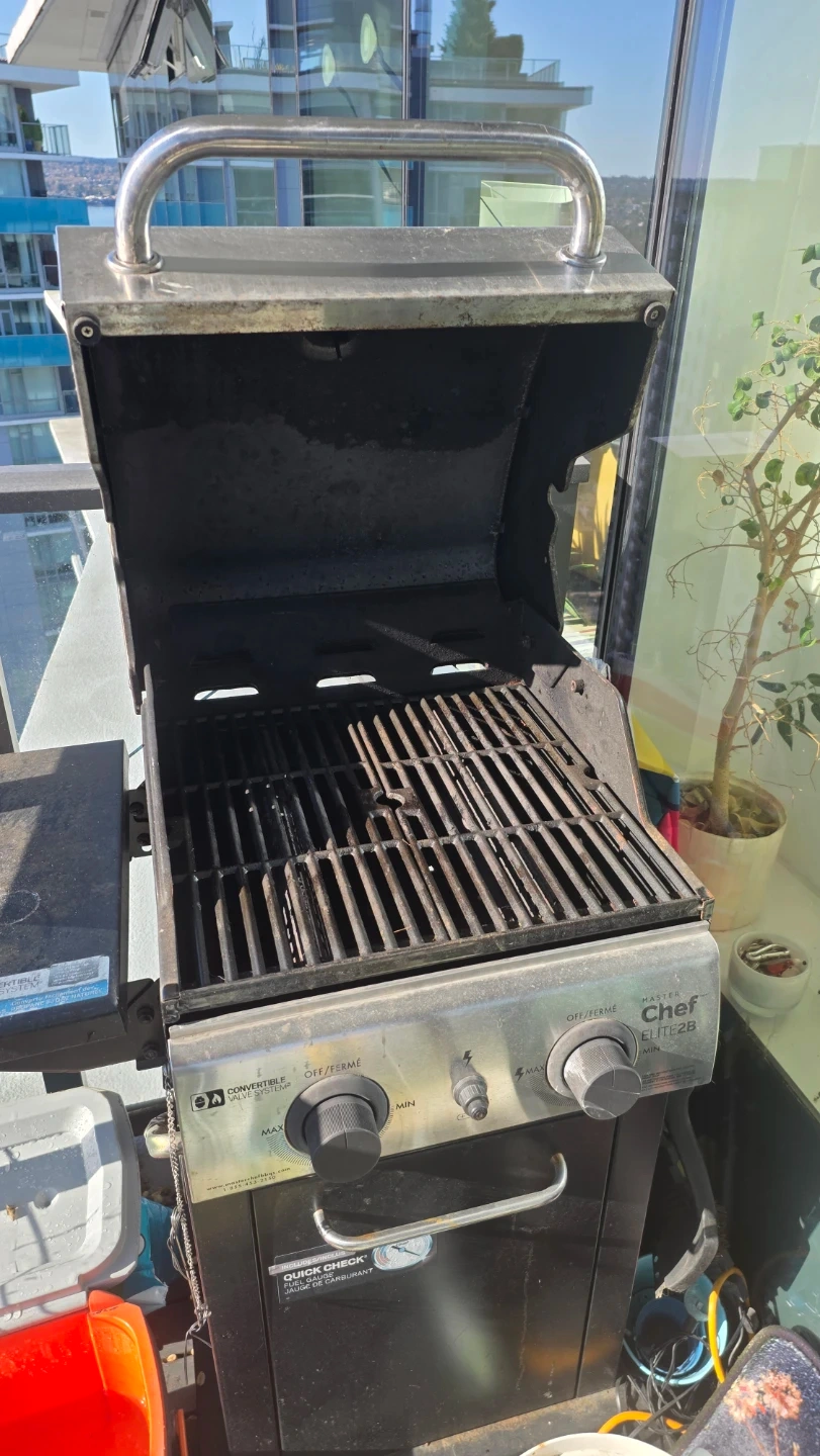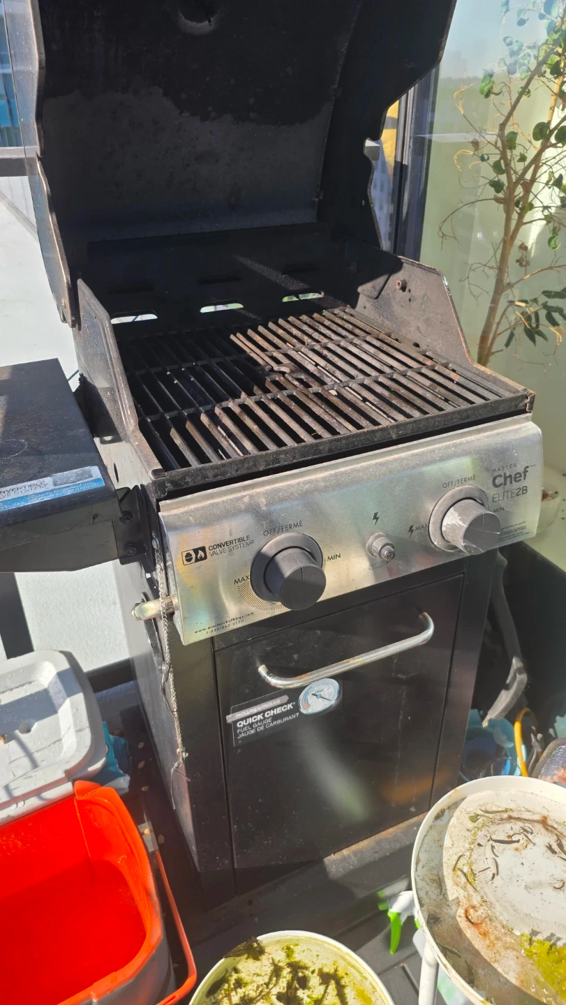 Master Chef Elite 2B propane BBQ. Features a convertible valve system and side shelf. It's great for cooking up a storm outdoors!