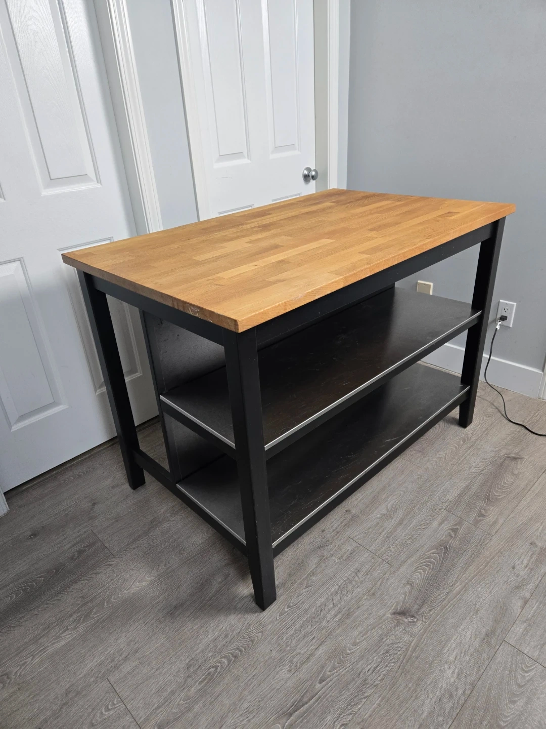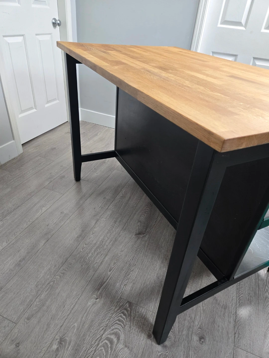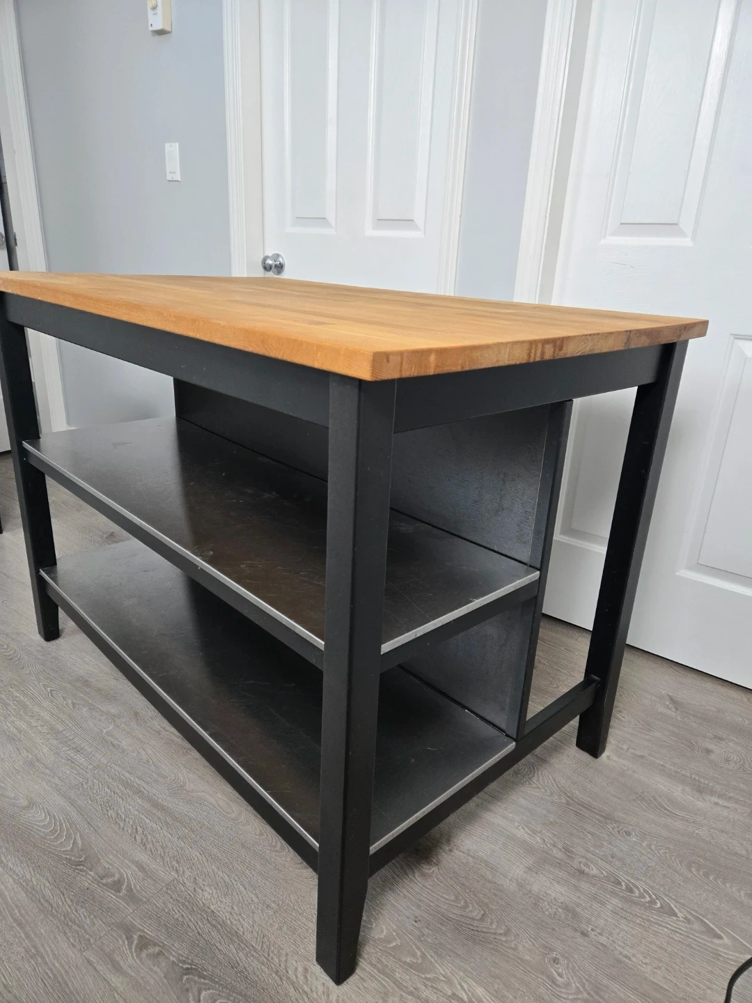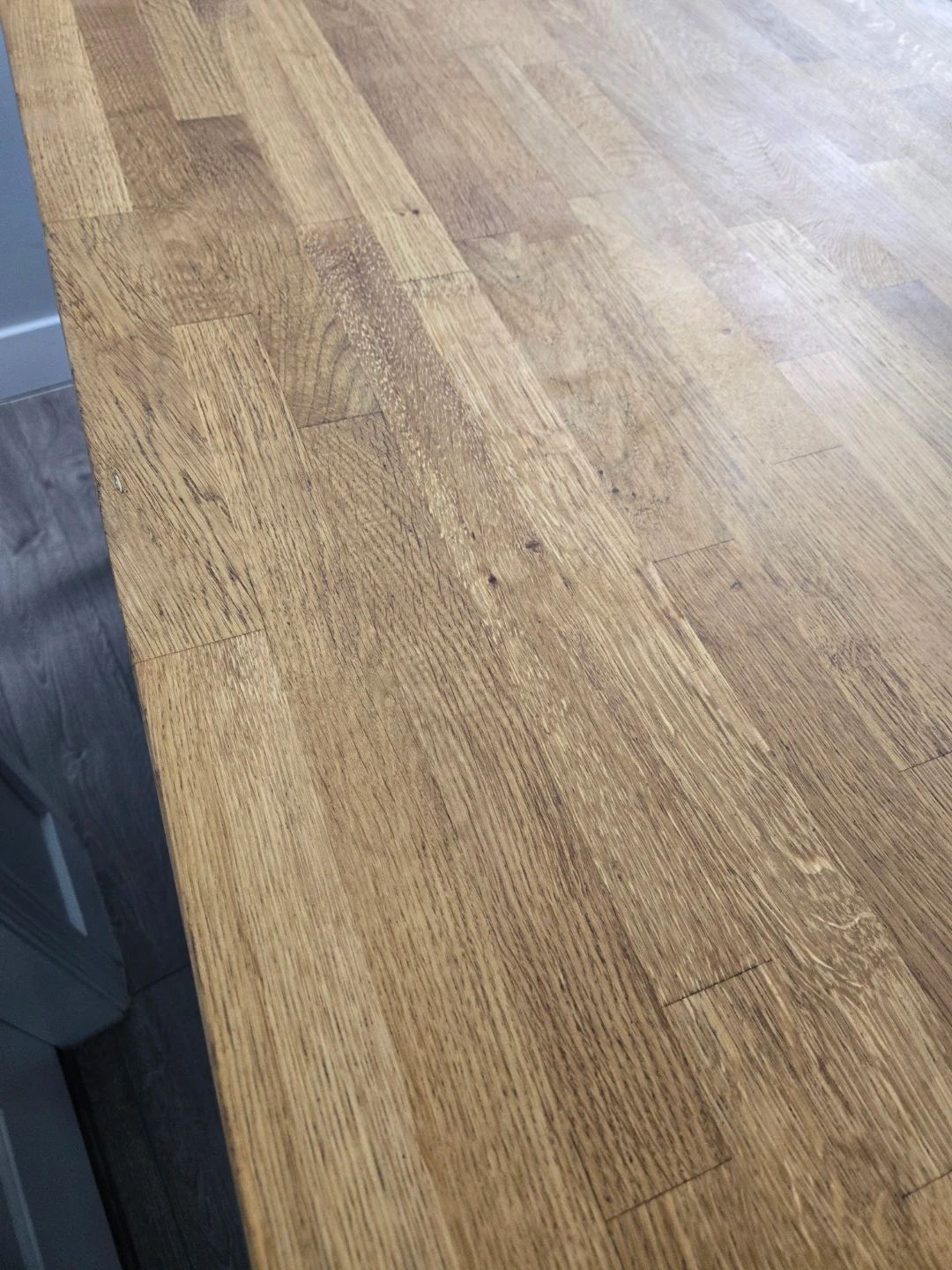 The butcher block has been sanded down smooth. Premium oils and waxes have been applied restoring it to perfect condition.