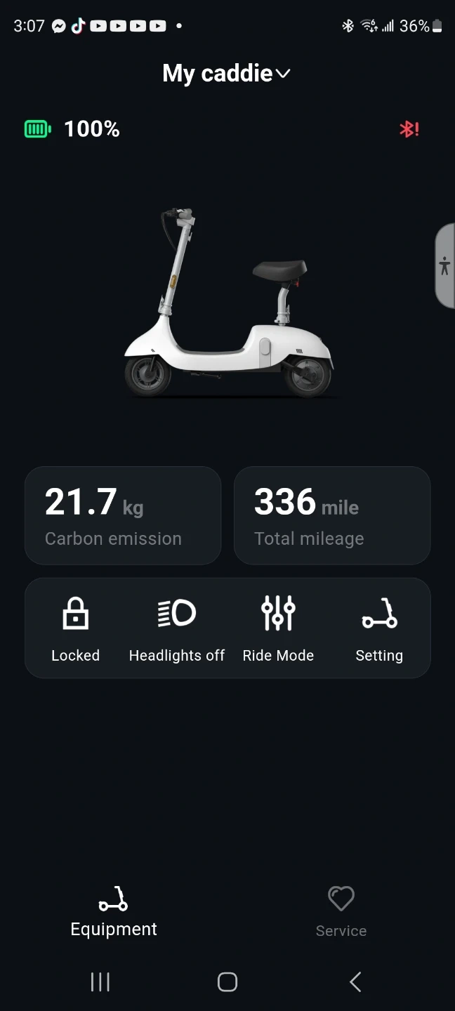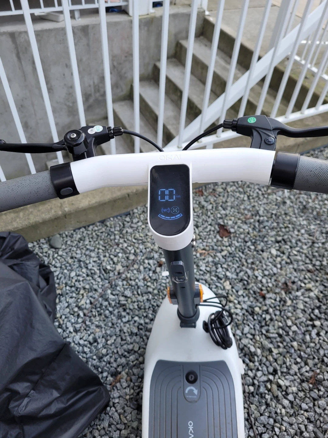 This is an OKAI electric scooter with a seat. It has a total mileage of 336 miles. The scooter comes with two keys for operation.