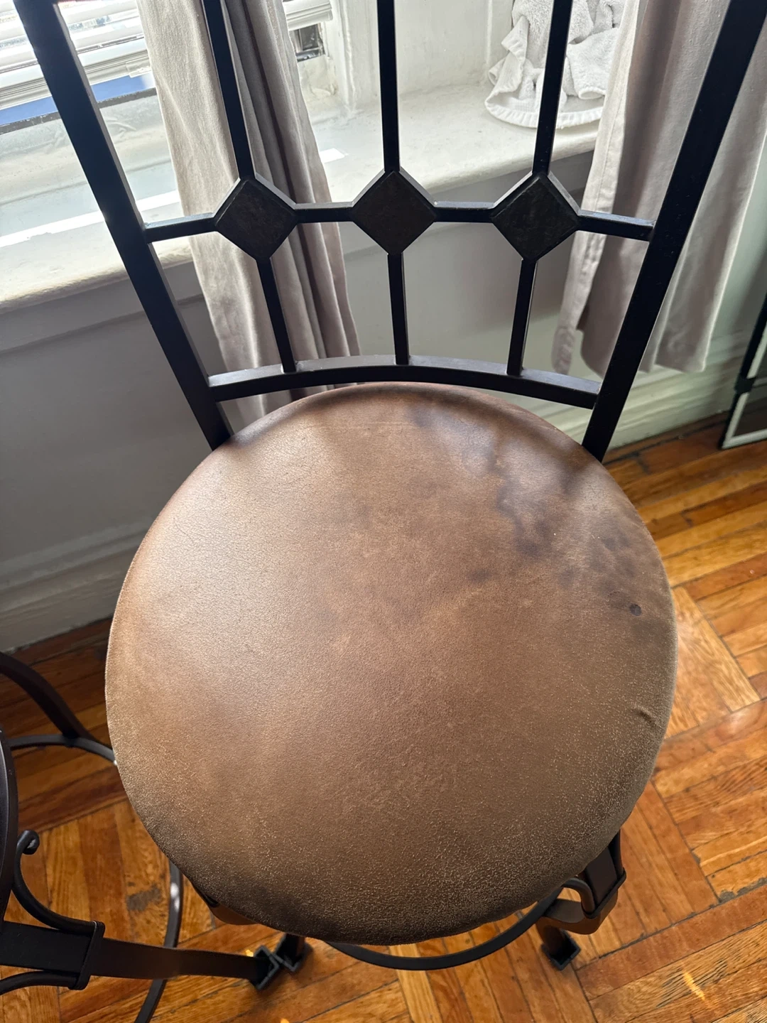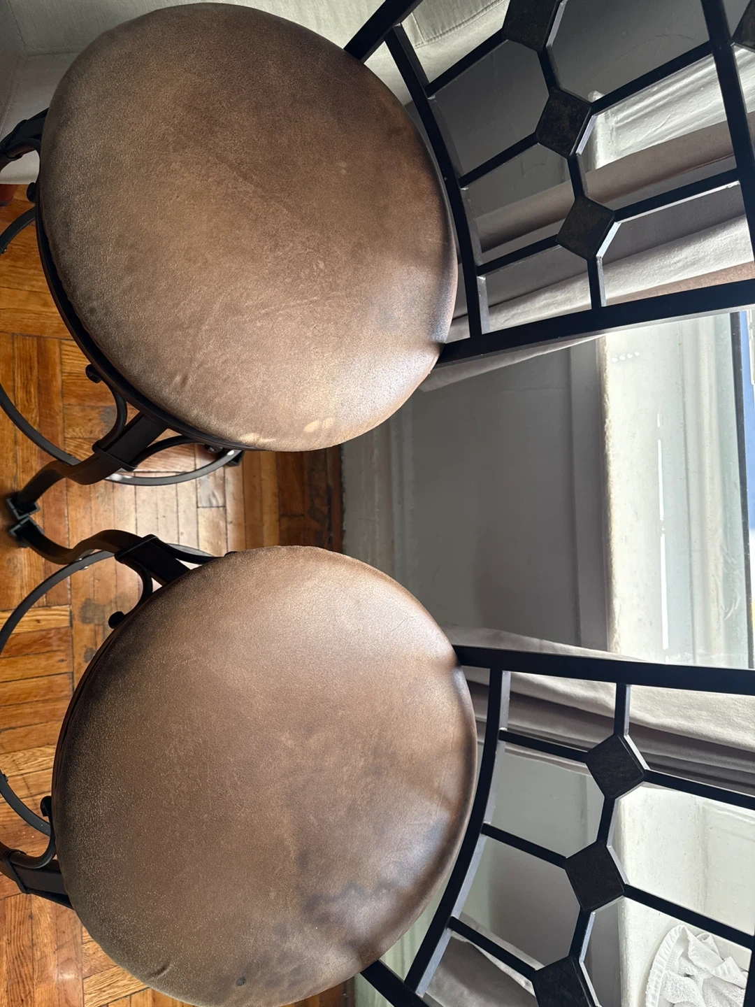 Set of two metal frame bar stools with brown upholstered seats and decorative metal backs. The frames are dark brown and feature curved legs with a circular footrest. These stools would be great for a kitchen island or bar area. Upholstery has a few stains. Feet need replacement felt