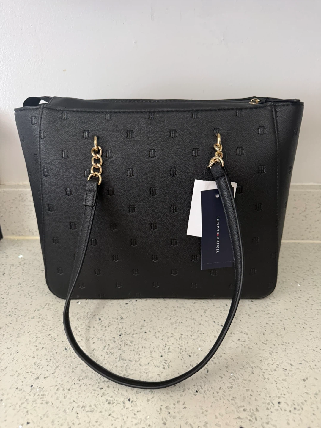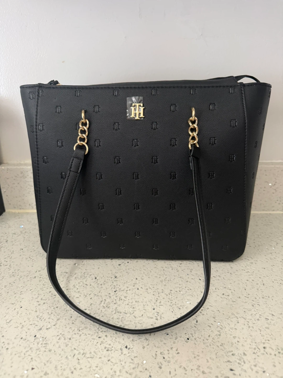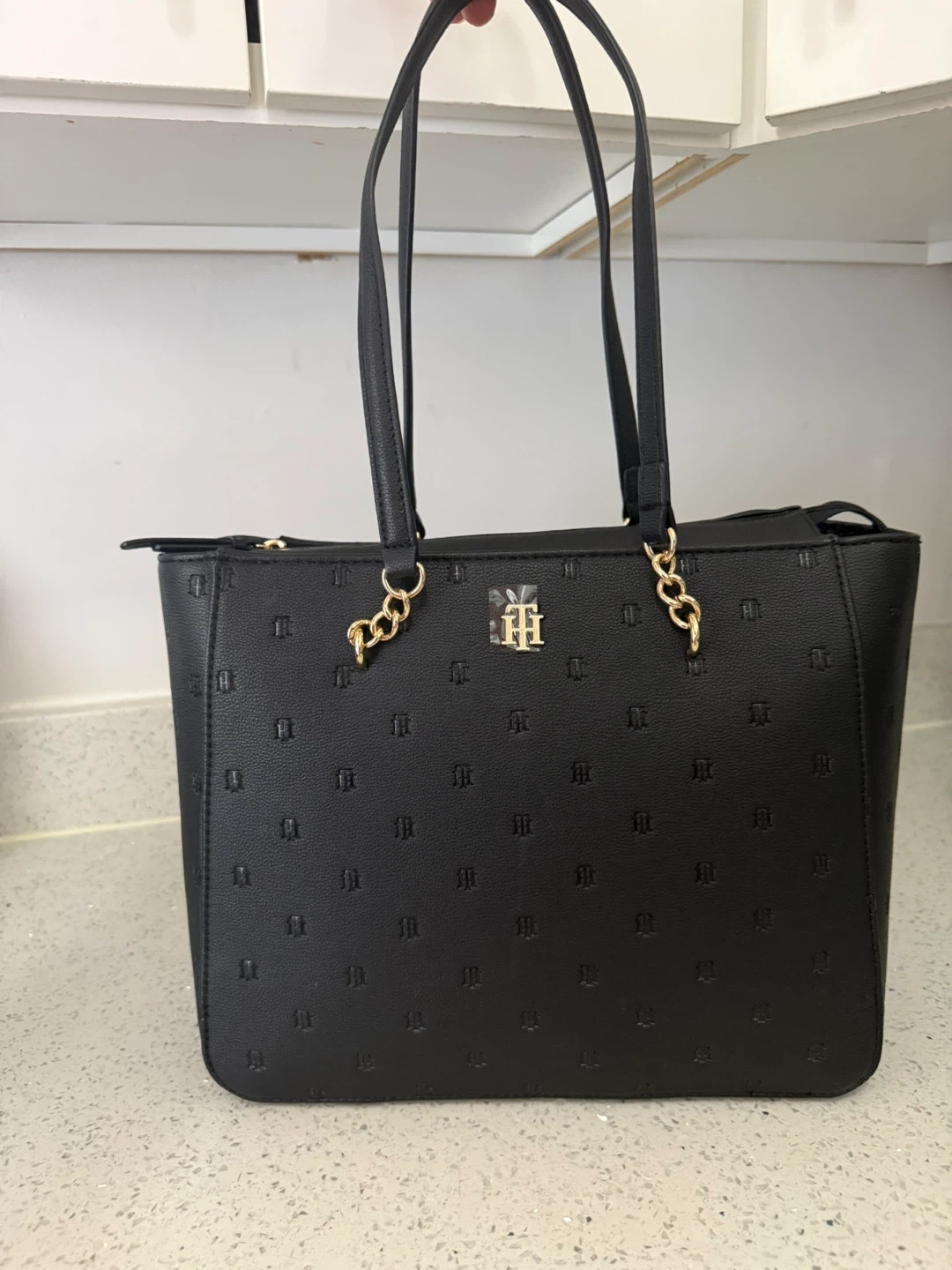 Classic black tote bag with all-over TH monogram pattern. Features gold-tone hardware and chain accents on the straps. It has a zippered closure and a lined interior.