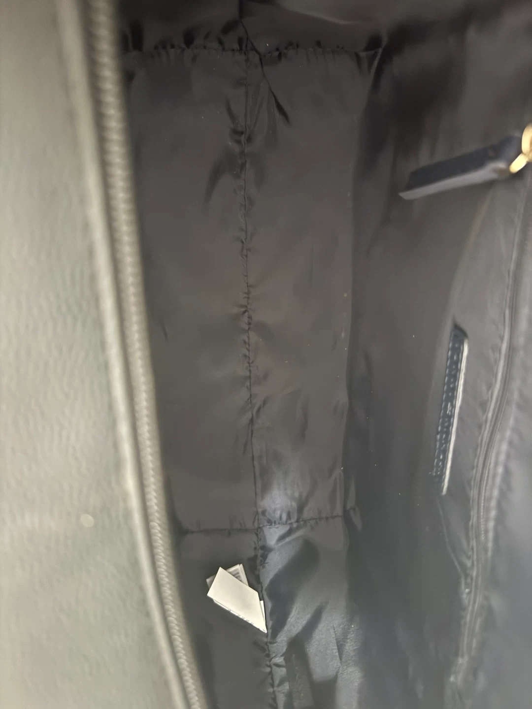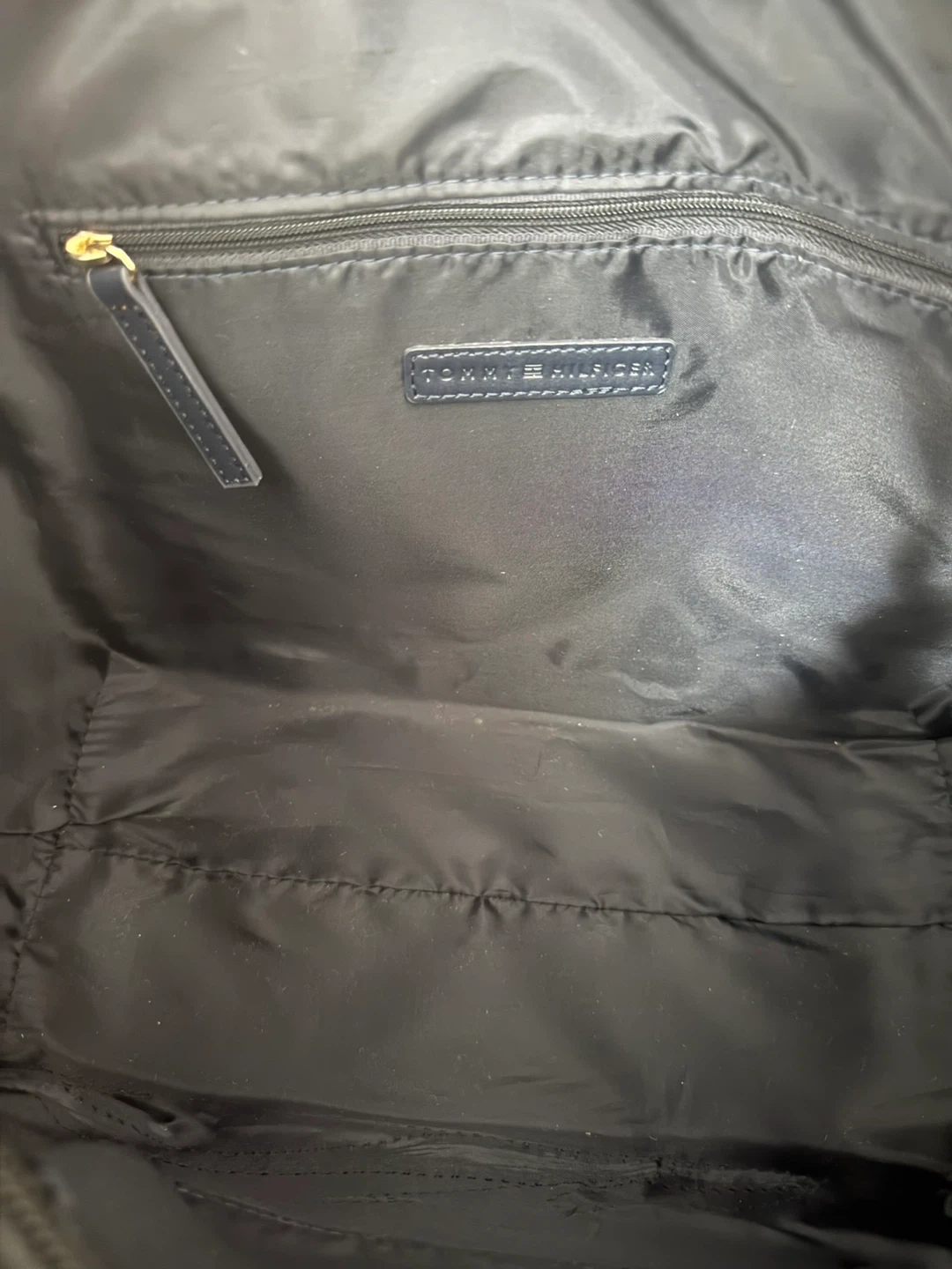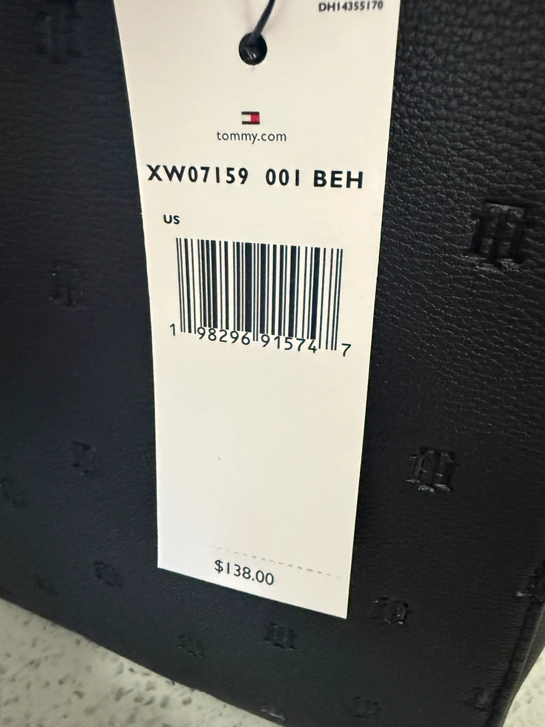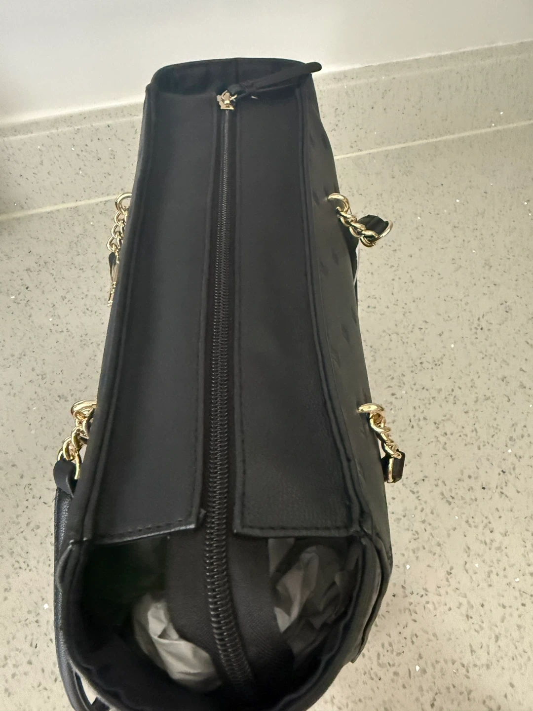 Classic black tote bag with all-over TH monogram pattern. Features gold-tone hardware and chain accents on the straps. It has a zippered closure and a lined interior.