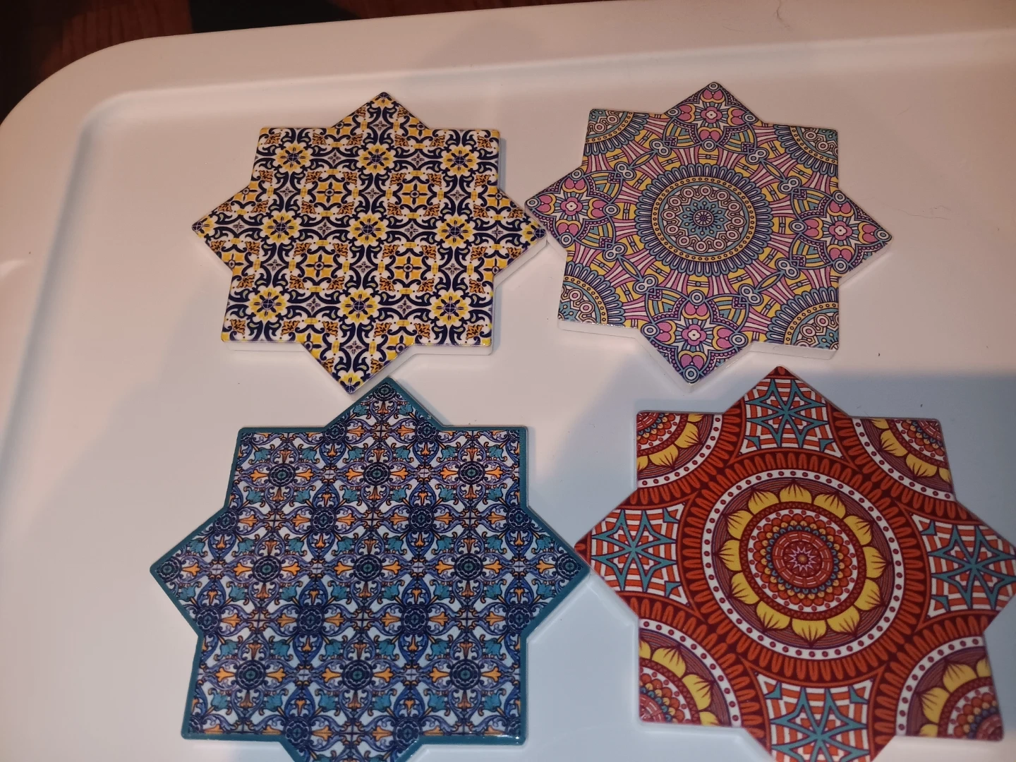Decorative coasters, each with colorful patterns. They're made with a ceramic top and a cork backing. Perfect for protecting surfaces from drinks! 14 coasters in bundle for $4. Some genuine marble, plastic, ceramic.