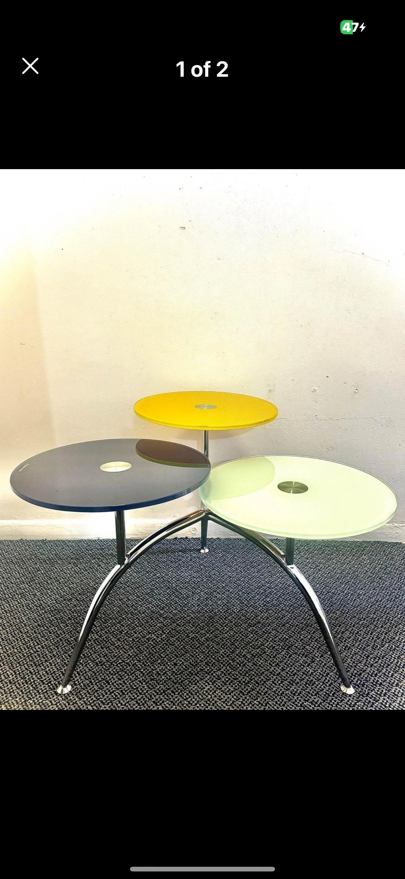 This coffee table has three tiers and is in great shape. The table is made of metal and glass. The three tiers are removable and can be arranged in a variety of ways.