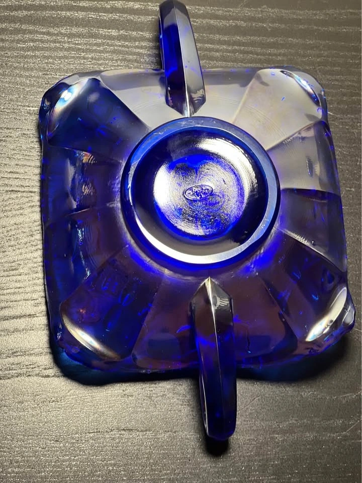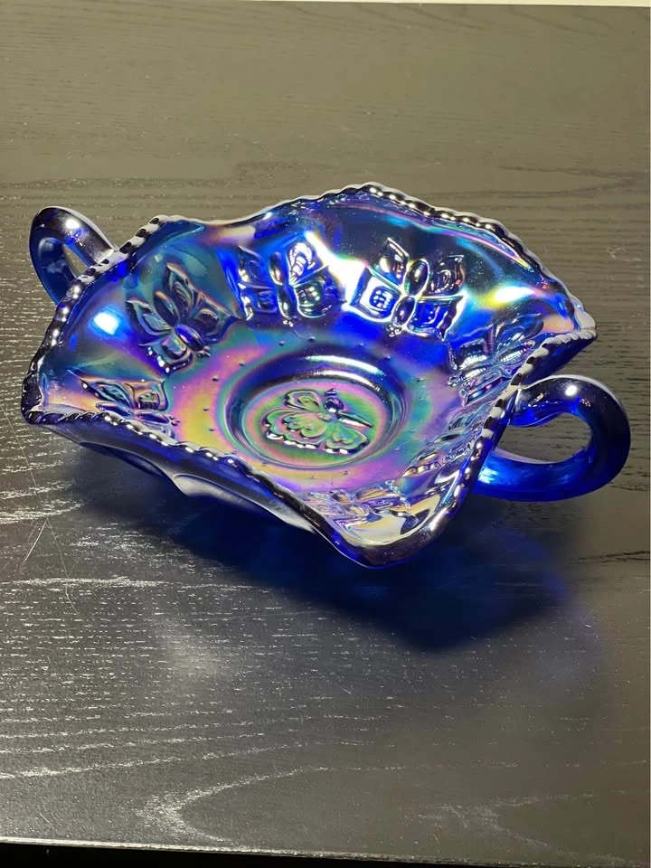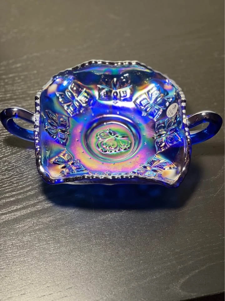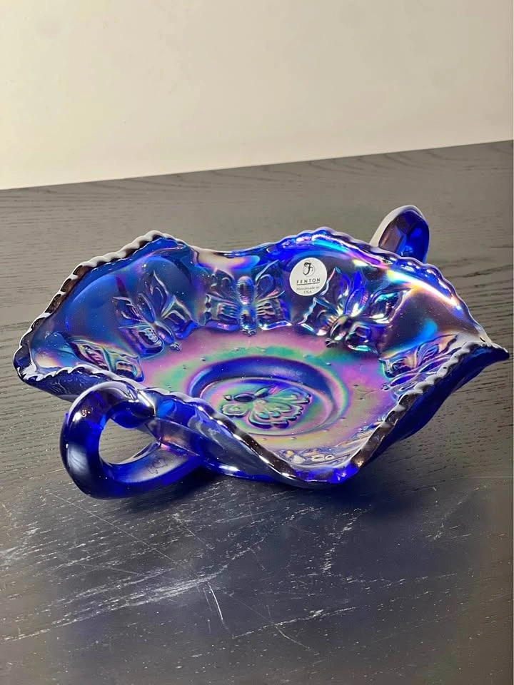 This is a vintage Fenton blue iridescent carnival glass "Butterfly" pattern bonbon dish with two handles. It's made of cobalt blue glass and features an iridescent, rainbow-hued finish, characteristic of carnival glass. Key Features: Manufacturer: Fenton Art Glass Company. Pattern: "Butterfly" or "Butterfly and Berry". Color: Cobalt blue with iridescent carnival finish. Design: Scalloped or ruffled edge, two handles, and an embossed butterfly and floral pattern. Era: Likely a "revival" piece from the 1970s or later, based on the oval "Fenton" mark. Preowned. Pickup is 58th and 7th Ave in midtown Manhattan.