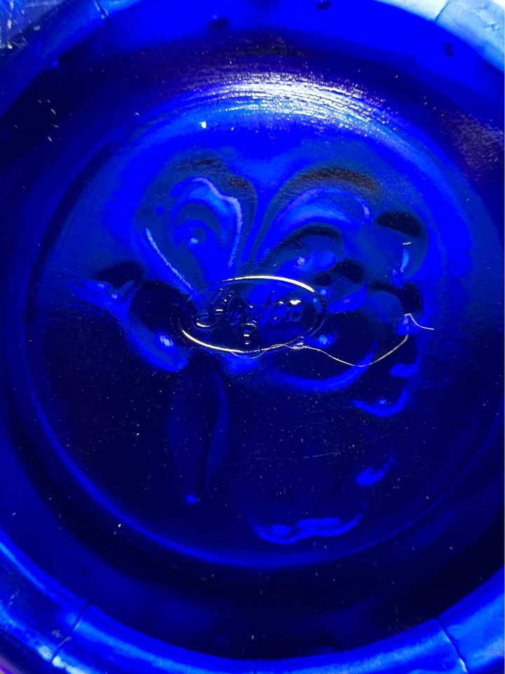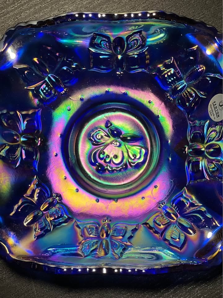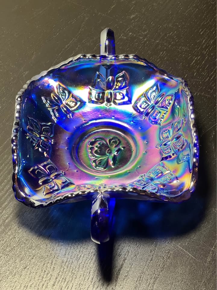 This is a vintage Fenton blue iridescent carnival glass "Butterfly" pattern bonbon dish with two handles. It's made of cobalt blue glass and features an iridescent, rainbow-hued finish, characteristic of carnival glass. Key Features: Manufacturer: Fenton Art Glass Company. Pattern: "Butterfly" or "Butterfly and Berry". Color: Cobalt blue with iridescent carnival finish. Design: Scalloped or ruffled edge, two handles, and an embossed butterfly and floral pattern. Era: Likely a "revival" piece from the 1970s or later, based on the oval "Fenton" mark. Preowned. Pickup is 58th and 7th Ave in midtown Manhattan.