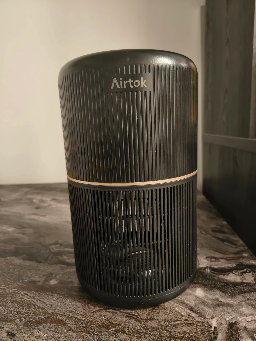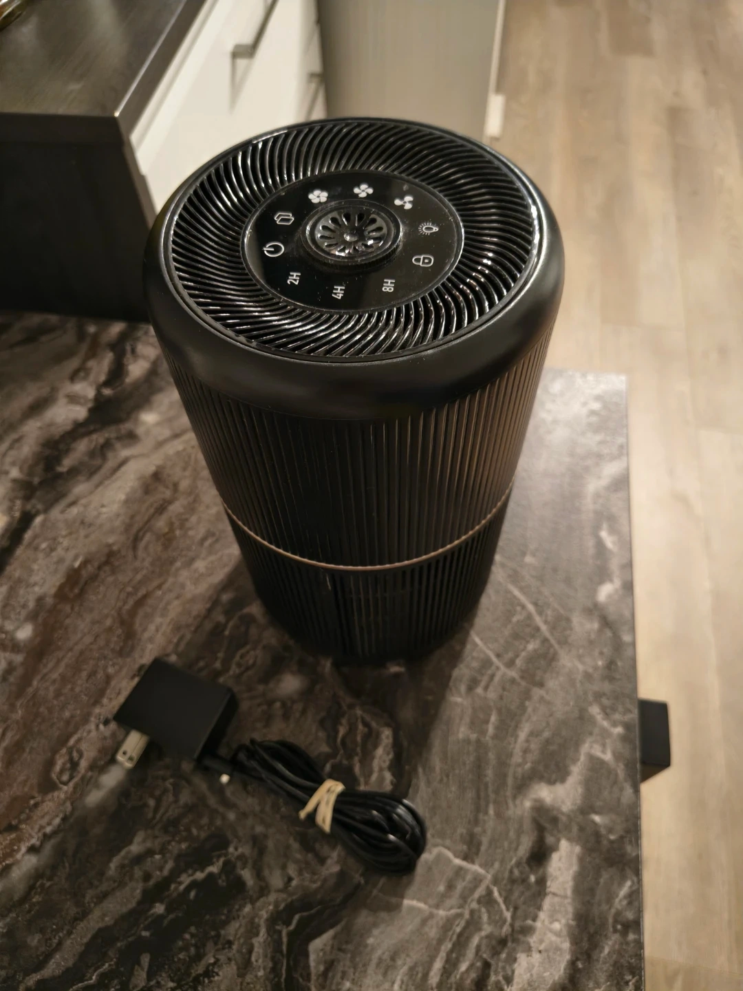 Black Airtok air purifier. It includes the main unit and its power adapter. The unit has a timer function with 2H, 4H, and 8H settings.