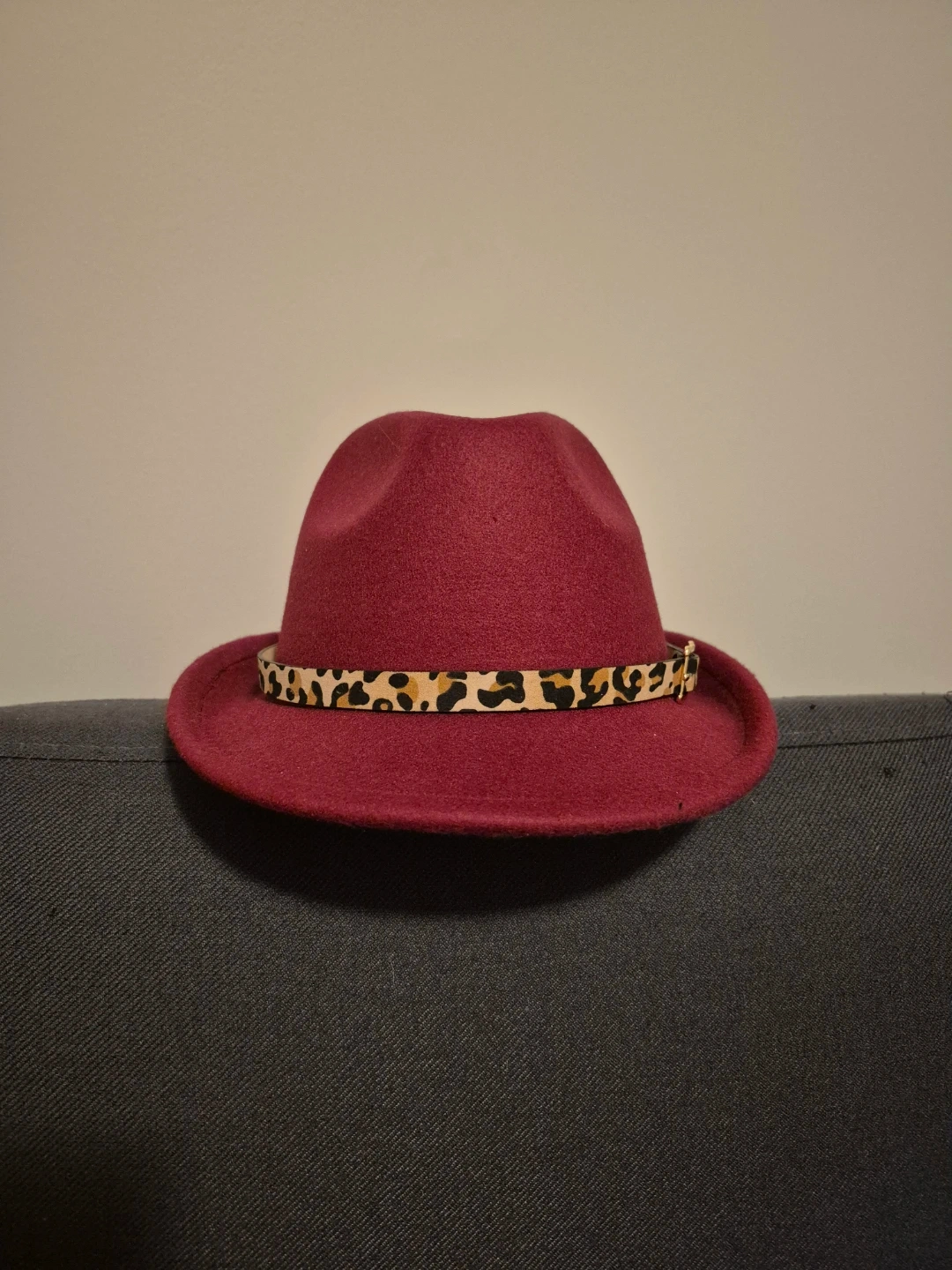 A stylish maroon fedora hat is adorned with a chic leopard print band. It's crafted from felt material for a classic look. This hat adds a touch of flair to any outfit!